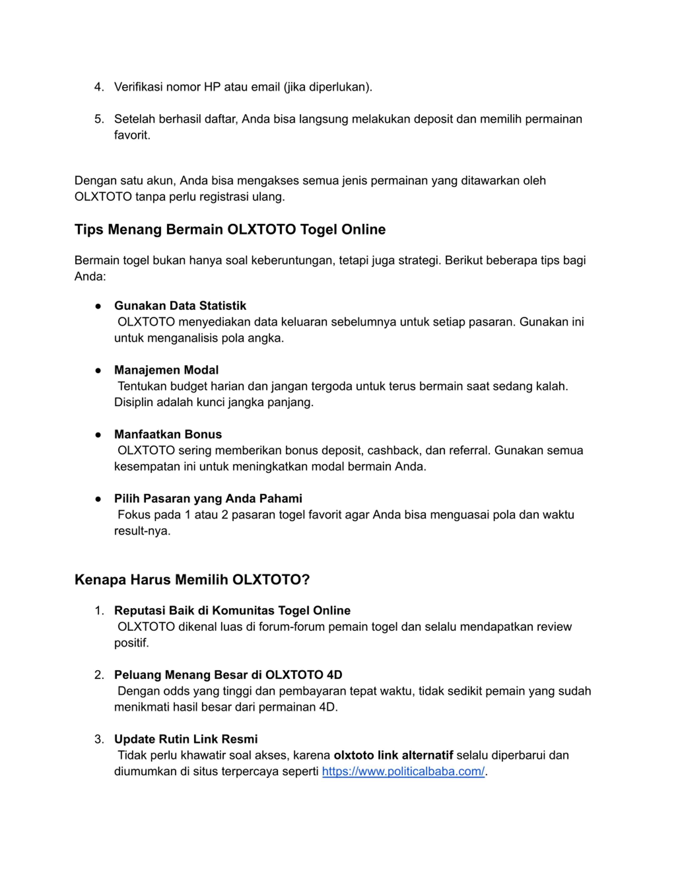 4. Verifikasi nomor HP atau email (jika diperlukan). 5. Setelah berhasil daftar, Anda bisa langsung melakukan deposit dan memilih permainan favorit. Dengan satu akun, Anda bisa mengakses semua jenis permainan yang ditawarkan oleh OLXTOTO tanpa perlu registrasi ulang. Tips Menang Bermain OLXTOTO Togel Online Bermain togel bukan hanya soal keberuntungan, tetapi juga strategi. Berikut beberapa tips bagi Anda: Gunakan Data Statistik OLXTOTO menyediakan data keluaran sebelumnya untuk setiap pasaran. Gunakan ini untuk menganalisis pola angka. Manajemen Modal Tentukan budget harian dan jangan tergoda untuk terus bermain saat sedang kalah. Disiplin adalah kunci jangka panjang. Manfaatkan Bonus OLXTOTO sering memberikan bonus deposit, cashback, dan referral. Gunakan semua kesempatan ini untuk meningkatkan modal bermain Anda. Pilih Pasaran yang Anda Pahami Fokus pada 1 atau 2 pasaran togel favorit agar Anda bisa menguasai pola dan waktu result-nya. Kenapa Harus Memilih OLXTOTO? 1. Reputasi Baik di Komunitas Togel Online OLXTOTO dikenal luas di forum-forum pemain togel dan selalu mendapatkan review positif. 2. Peluang Menang Besar di OLXTOTO 4D Dengan odds yang tinggi dan pembayaran tepat waktu, tidak sedikit pemain yang sudah menikmati hasil besar dari permainan 4D. 3. Update Rutin Link Resmi Tidak perlu khawatir soal akses, karena olxtoto link alternatif selalu diperbarui dan diumumkan di situs terpercaya seperti https://www.politicalbaba.com/.