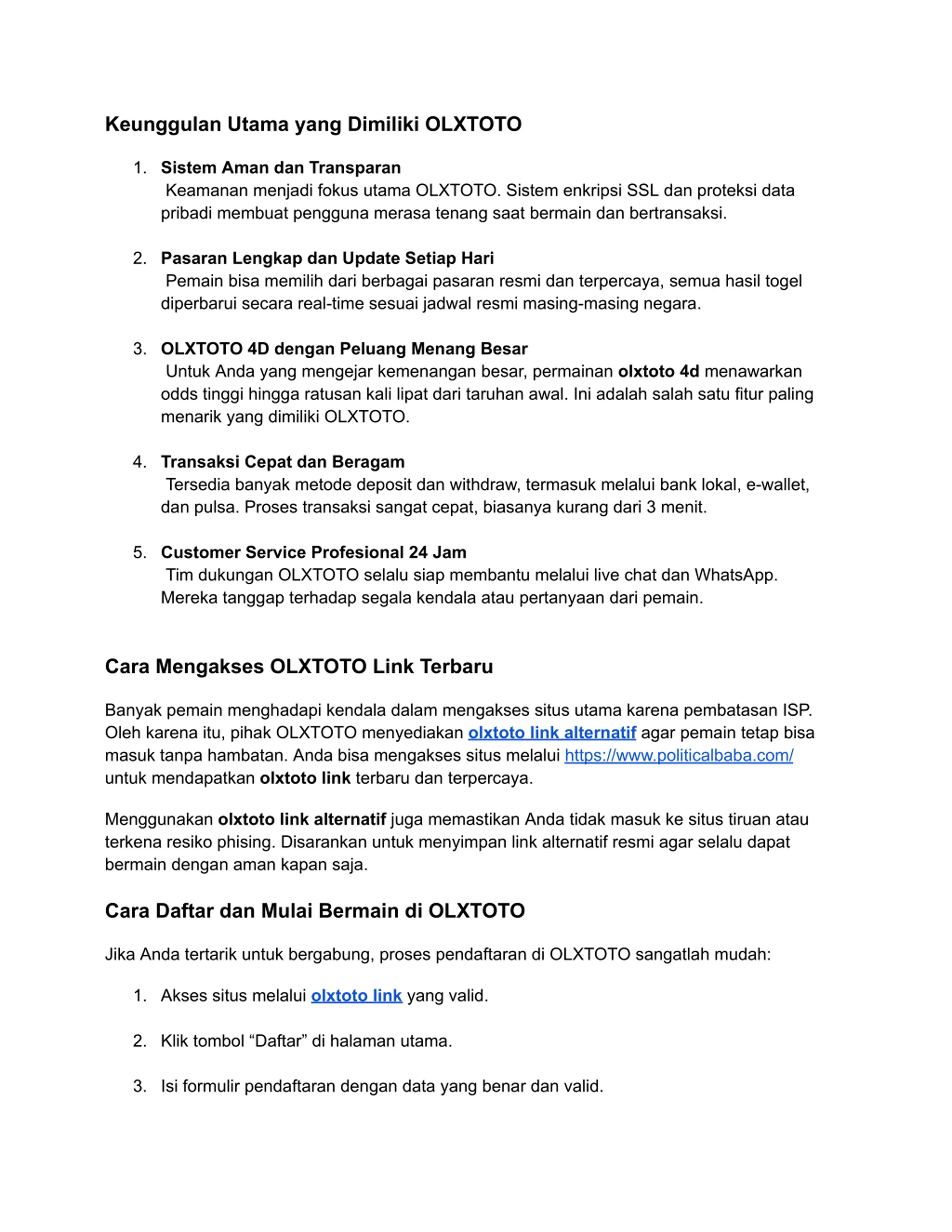 Keunggulan Utama yang Dimiliki OLXTOTO 1. Sistem Aman dan Transparan Keamanan menjadi fokus utama OLXTOTO. Sistem enkripsi SSL dan proteksi data pribadi membuat pengguna merasa tenang saat bermain dan bertransaksi. 2. Pasaran Lengkap dan Update Setiap Hari Pemain bisa memilih dari berbagai pasaran resmi dan terpercaya, semua hasil togel diperbarui secara real-time sesuai jadwal resmi masing-masing negara. 3. OLXTOTO 4D dengan Peluang Menang Besar Untuk Anda yang mengejar kemenangan besar, permainan olxtoto 4d menawarkan odds tinggi hingga ratusan kali lipat dari taruhan awal. Ini adalah salah satu fitur paling menarik yang dimiliki OLXTOTO. 4. Transaksi Cepat dan Beragam Tersedia banyak metode deposit dan withdraw, termasuk melalui bank lokal, e-wallet, dan pulsa. Proses transaksi sangat cepat, biasanya kurang dari 3 menit. 5. Customer Service Profesional 24 Jam Tim dukungan OLXTOTO selalu siap membantu melalui live chat dan WhatsApp. Mereka tanggap terhadap segala kendala atau pertanyaan dari pemain. Cara Mengakses OLXTOTO Link Terbaru Banyak pemain menghadapi kendala dalam mengakses situs utama karena pembatasan ISP. Oleh karena itu, pihak OLXTOTO menyediakan olxtoto link alternatif agar pemain tetap bisa masuk tanpa hambatan. Anda bisa mengakses situs melalui https://www.politicalbaba.com/ untuk mendapatkan olxtoto link terbaru dan terpercaya. Menggunakan olxtoto link alternatif juga memastikan Anda tidak masuk ke situs tiruan atau terkena resiko phising. Disarankan untuk menyimpan link alternatif resmi agar selalu dapat bermain dengan aman kapan saja. Cara Daftar dan Mulai Bermain di OLXTOTO Jika Anda tertarik untuk bergabung, proses pendaftaran di OLXTOTO sangatlah mudah: 1. Akses situs melalui olxtoto link yang valid. 2. Klik tombol Daftar di halaman utama. 3. Isi formulir pendaftaran dengan data yang benar dan valid.