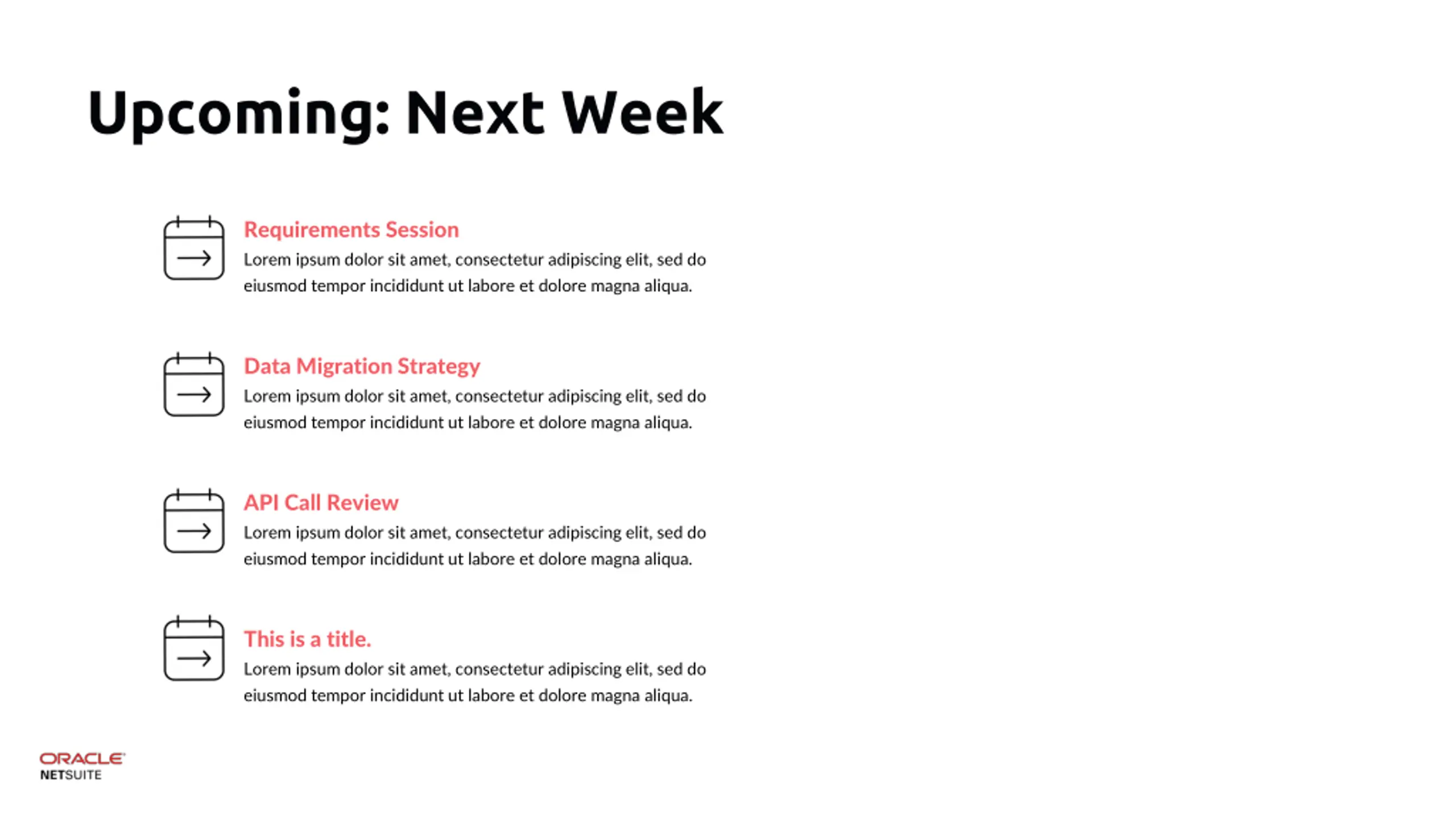 Upcoming: Next Week Requirements Session Lorem ipsum dolor sit amet, consectetur adipiscing elit, sed do eiusmod tempor incididunt ut labore et dolore magna aliqua. Data Migration Strategy Lorem ipsum dolor sit amet, consectetur adipiscing elit, sed do eiusmod tempor incididunt ut labore et dolore magna aliqua. API Call Review Lorem ipsum dolor sit amet, consectetur adipiscing elit, sed do eiusmod tempor incididunt ut labore et dolore magna aliqua. This is a title. Lorem ipsum dolor sit amet, consectetur adipiscing elit, sed do eiusmod tempor incididunt ut labore et dolore magna aliqua.
