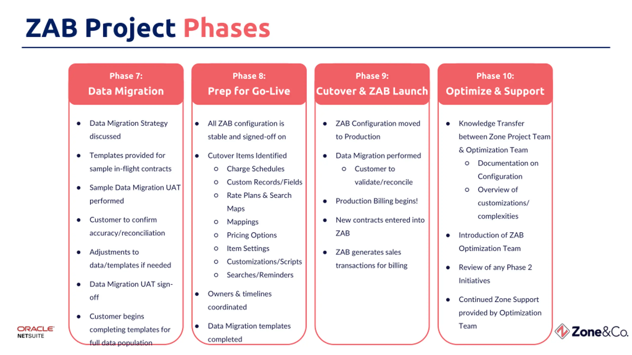ZAB Project Phases Phase 7: Phase 8: Phase 9: Phase 10: Data Migration Prep for Go-Live Cutover & ZAB Launch Optimize & Support Data Migration Strategy All ZAB configuration is ZAB Configuration moved Knowledge Transfer discussed stable and signed-off on to Production between Zone Project Team & Optimization Team Templates provided for Cutover Items Identified Data Migration performed Documentation on sample in-flight contracts Charge Schedules Customer to Configuration Custom Records/Fields validate/reconcile Sample Data Migration UAT Overview of Rate Plans & Search performed Production Billing begins! customizations/ Maps complexities Customer to confirm New contracts entered into Mappings accuracy/reconciliation ZAB Pricing Options Introduction of ZAB Item Settings Optimization Team Adjustments to ZAB generates sales Customizations/Scripts data/templates if needed transactions for billing Review of any Phase 2 Searches/Reminders Initiatives Data Migration UAT sign- Owners & timelines off Continued Zone Support coordinated provided by Optimization Customer begins Data Migration templates Team completing templates for completed full data population