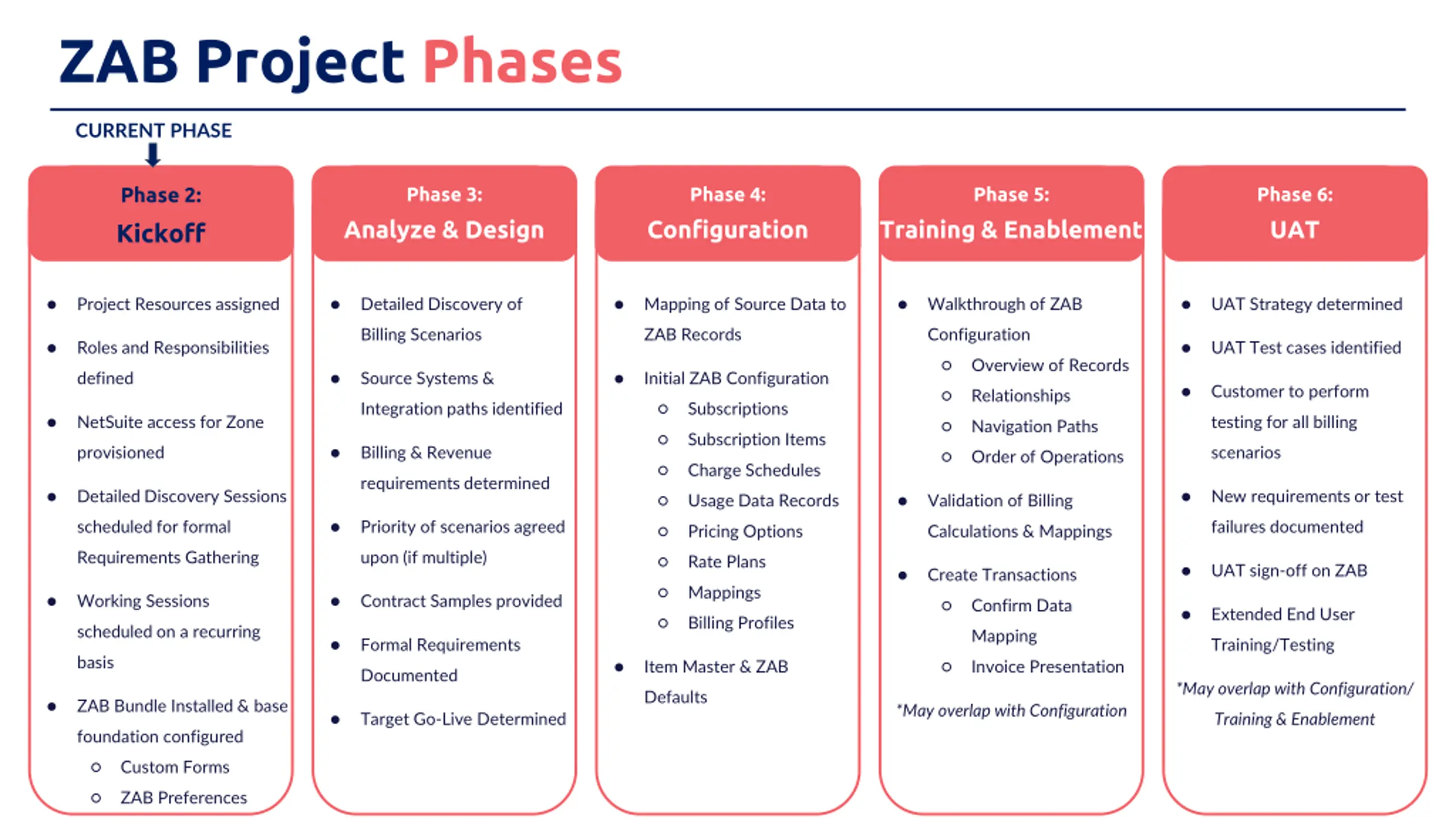 ZAB Project Phases CURRENT PHASE Phase 2: Kickoff Phase 3: Phase 4: Phase 5: Phase 6: UAT Analyze & Design Configuration Training & Enablement Project Resources assigned Detailed Discovery of Mapping of Source Data to Walkthrough of ZAB UAT Strategy determined Billing Scenarios ZAB Records Configuration Roles and Responsibilities UAT Test cases identified Overview of Records defined Source Systems & Initial ZAB Configuration Customer to perform Relationships Integration paths identified Subscriptions NetSuite access for Zone testing for all billing Navigation Paths Subscription Items provisioned Billing & Revenue scenarios Order of Operations Charge Schedules requirements determined Detailed Discovery Sessions New requirements or test Usage Data Records Validation of Billing scheduled for formal Priority of scenarios agreed failures documented Pricing Options Calculations & Mappings Requirements Gathering upon (if multiple) Rate Plans UAT sign-off on ZAB Create Transactions Mappings Working Sessions Contract Samples provided Confirm Data Extended End User Billing Profiles scheduled on a recurring Mapping Formal Requirements Training/Testing basis Item Master & ZAB Invoice Presentation Documented *May overlap with Configuration/ Defaults ZAB Bundle Installed & base *May overlap with Configuration Target Go-Live Determined Training & Enablement foundation configured Custom Forms ZAB Preferences
