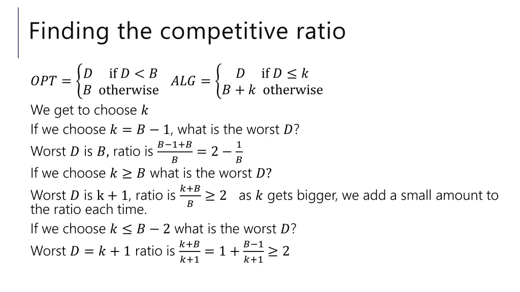 Finding the competitive ratio ? if ? ? ? + ? otherwise ??? = ? if ? < ? ? otherwise ??? = We get to choose ? If we choose ? = ? 1, what is the worst ?? If we choose ? = ? what is the worst ?? If we choose ? ? 2 what is the worst ??