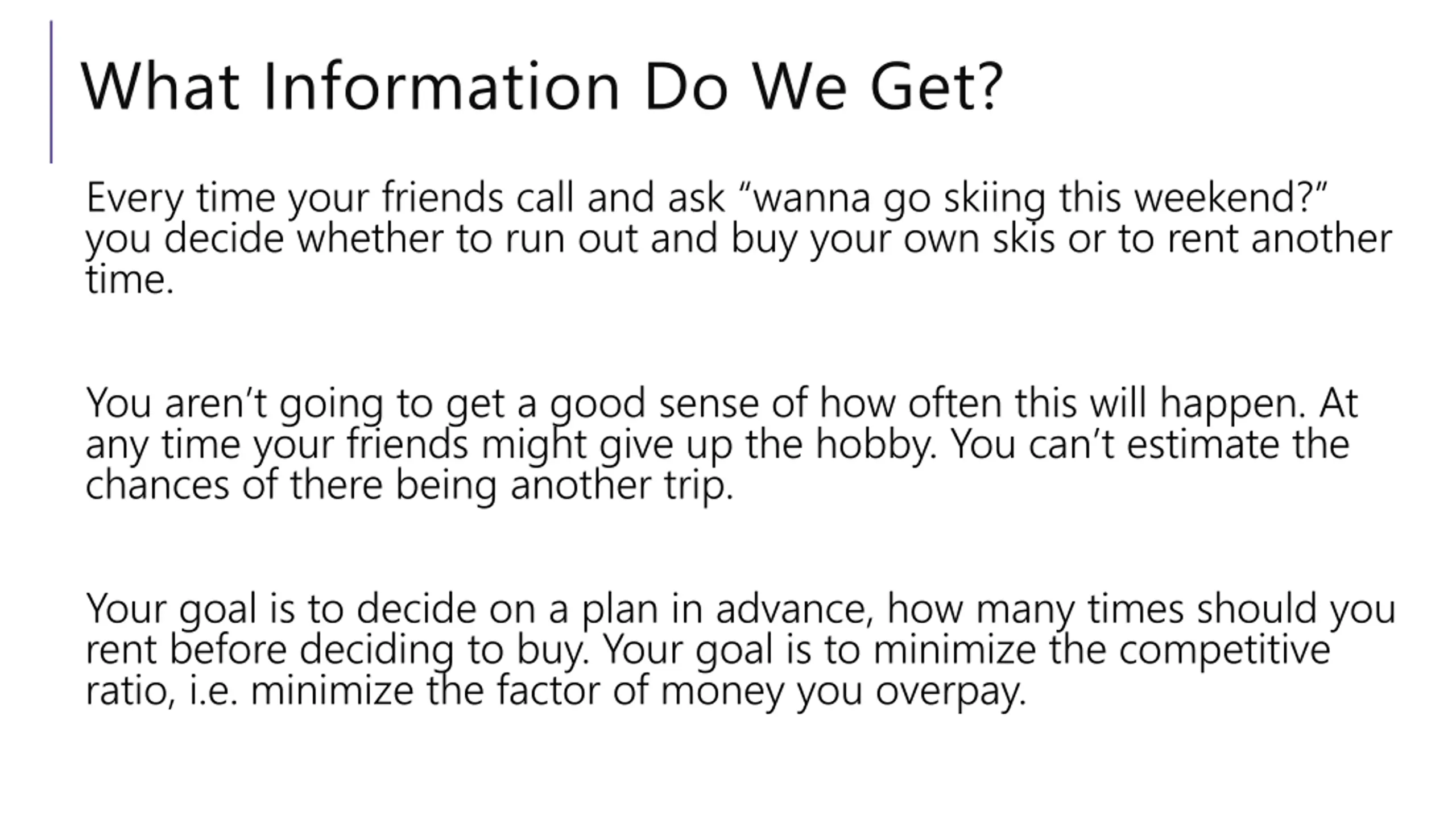 What Information Do We Get? Every time your friends call and ask wanna go skiing this weekend? you decide whether to run out and buy your own skis or to rent another time. You aren t going to get a good sense of how often this will happen. At any time your friends might give up the hobby. You can t estimate the chances of there being another trip. Your goal is to decide on a plan in advance, how many times should you rent before deciding to buy. Your goal is to minimize the competitive ratio, i.e. minimize the factor of money you overpay.