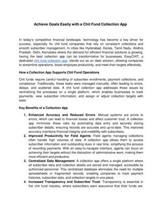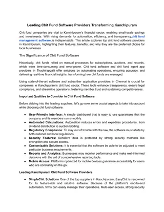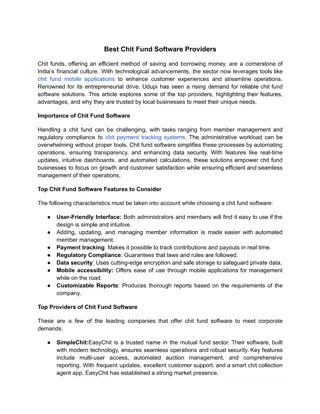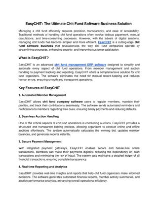 Online Chit Auction: The Future of Chit Fund Bidding Chit funds have been a trusted financial tool for generations, providing a disciplined savings and borrowing option for many individuals. Traditionally, chit auctions were conducted offline, requiring participants to be physically present. However, with the rise of digital platforms, the concept of online chit auction has revolutionized the process, making it more accessible, transparent, and secure. EasyCHIT is one of the best chit fund auction platforms, offering seamless digital solutions for chit fund organizers and members. By leveraging technology, online chit auction providers like EasyCHIT ensure a hassle-free experience for everyone involved. What is an Online Chit Auction? A chit online auction is a digital version of the traditional chit fund bidding process. Instead of attending physical meetings, members can participate in real-time auctions through an online platform. This method eliminates geographical barriers and provides greater flexibility, allowing users to bid from anywhere. In a best chit fund auction , the member who bids the highest discount (offering the most significant reduction in their payout) wins the auction and receives the chit amount. The remaining members continue contributing, ensuring a fair and transparent financial cycle. Why Choose an Online Chit Auction? With increasing digital adoption, online chit auction providers are changing the way chit funds operate. Here s why switching to an online chit auction is beneficial: 1. Convenience and Accessibility Gone are the days of attending physical auctions. With online chit auction platforms, participants can place bids from their smartphones or computers. This is especially beneficial for working professionals and business owners who may not have the time to attend offline auctions. 2. Transparent and Secure Process