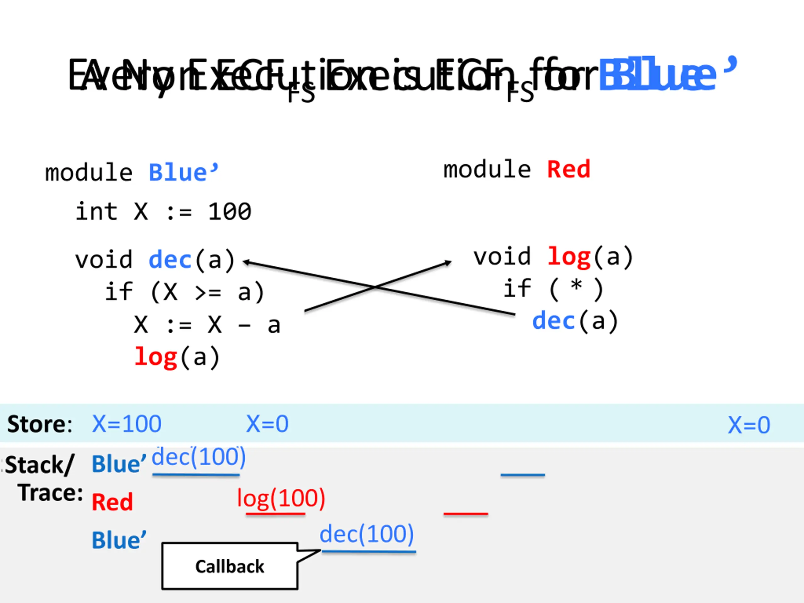 A Non ECFFS Execution for Blue module Red module Blue int X := 100 void log(a) if (*) dec(a) void dec(a) if (X >= a) log(a) X := X a X=100 X=0 Store: X=-100 dec(100) Blue Red Blue Red Stack/ Trace: log(100) dec(100) Callback log(100)