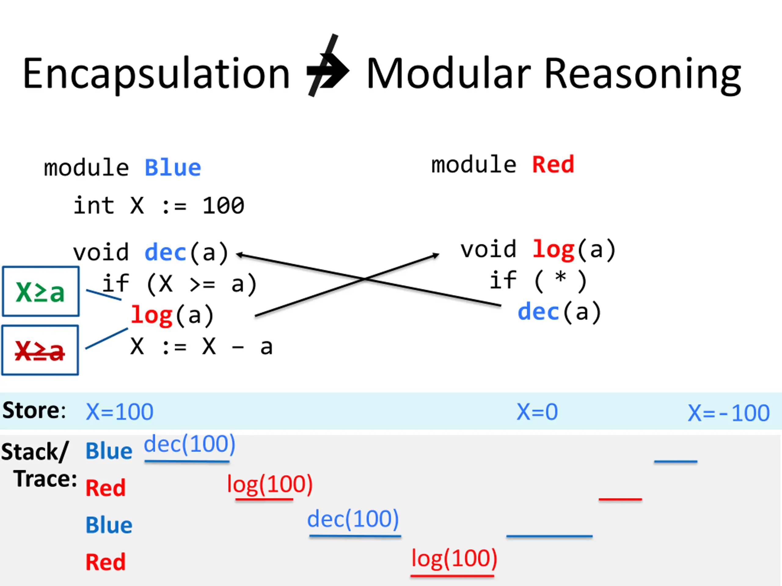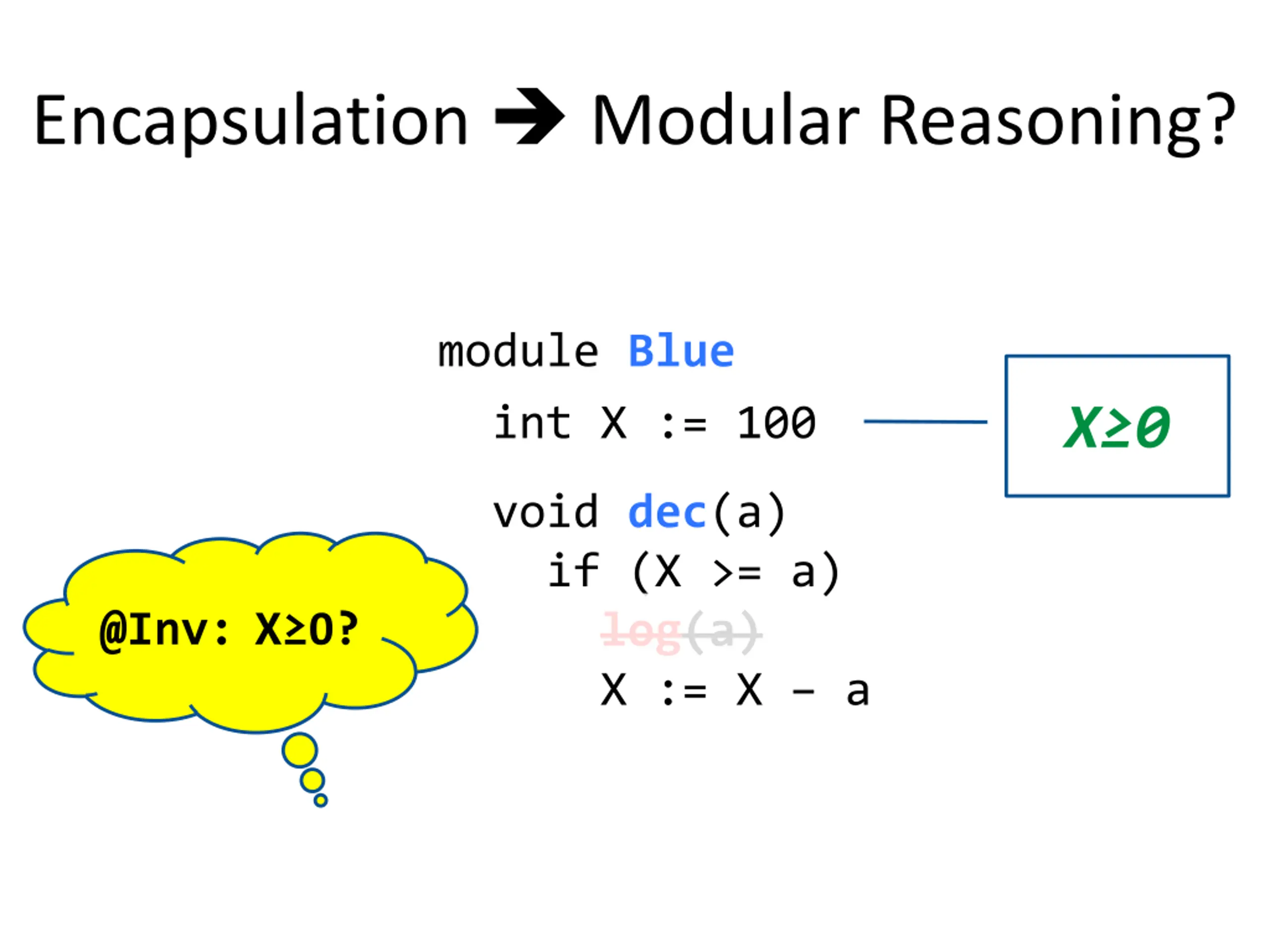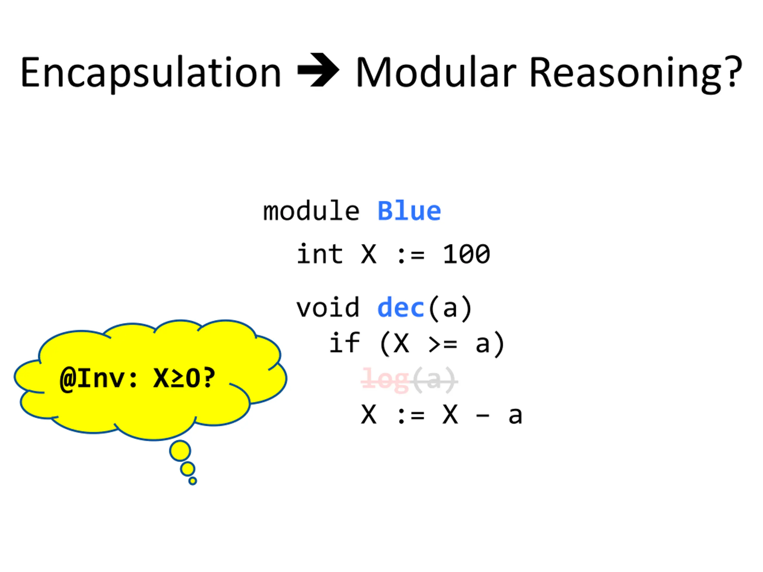 Encapsulation Modular Reasoning? module Blue int X := 100 void dec(a) if (X >= a) log(a) X := X a @Inv:X 0?