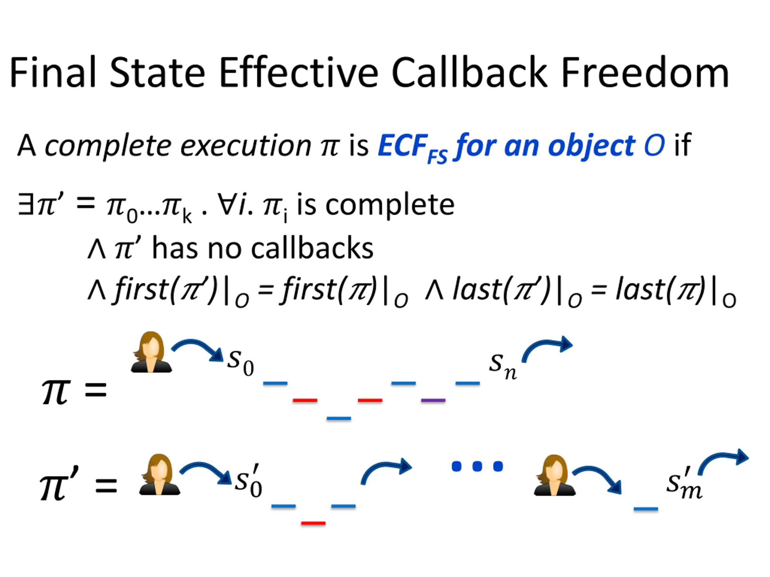 Final State Effective Callback Freedom A completeexecution? is ECFFS for an object O if ? = ?0 ?k . i. ?i is complete ? has no callbacks first(? )|O = first(?)|O last(? )|O = last(?)|O