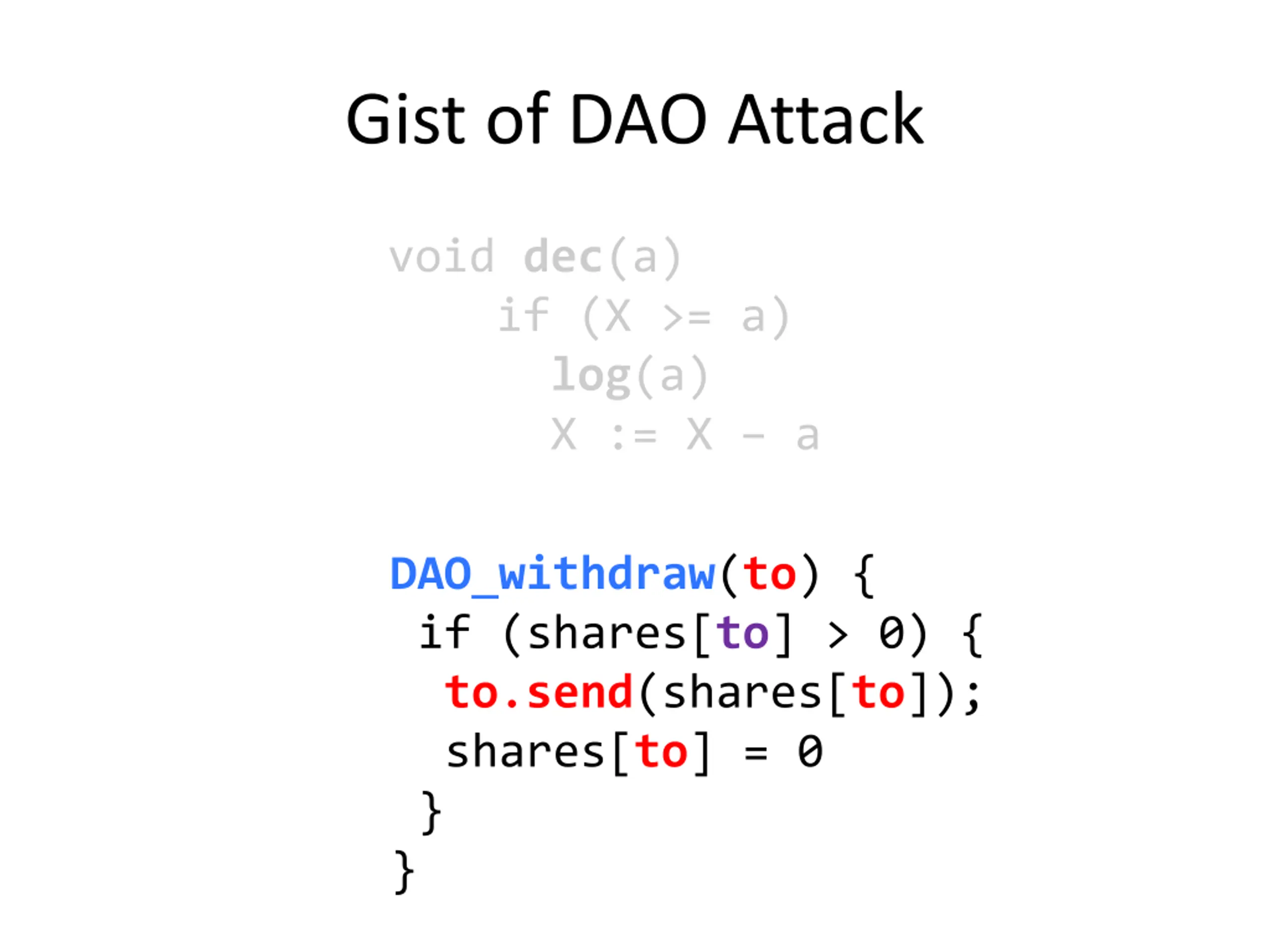 Gist of DAO Attack DAO_withdraw(to) { if (shares[to] > 0) { to.send(shares[to]); shares[to] = 0 } }