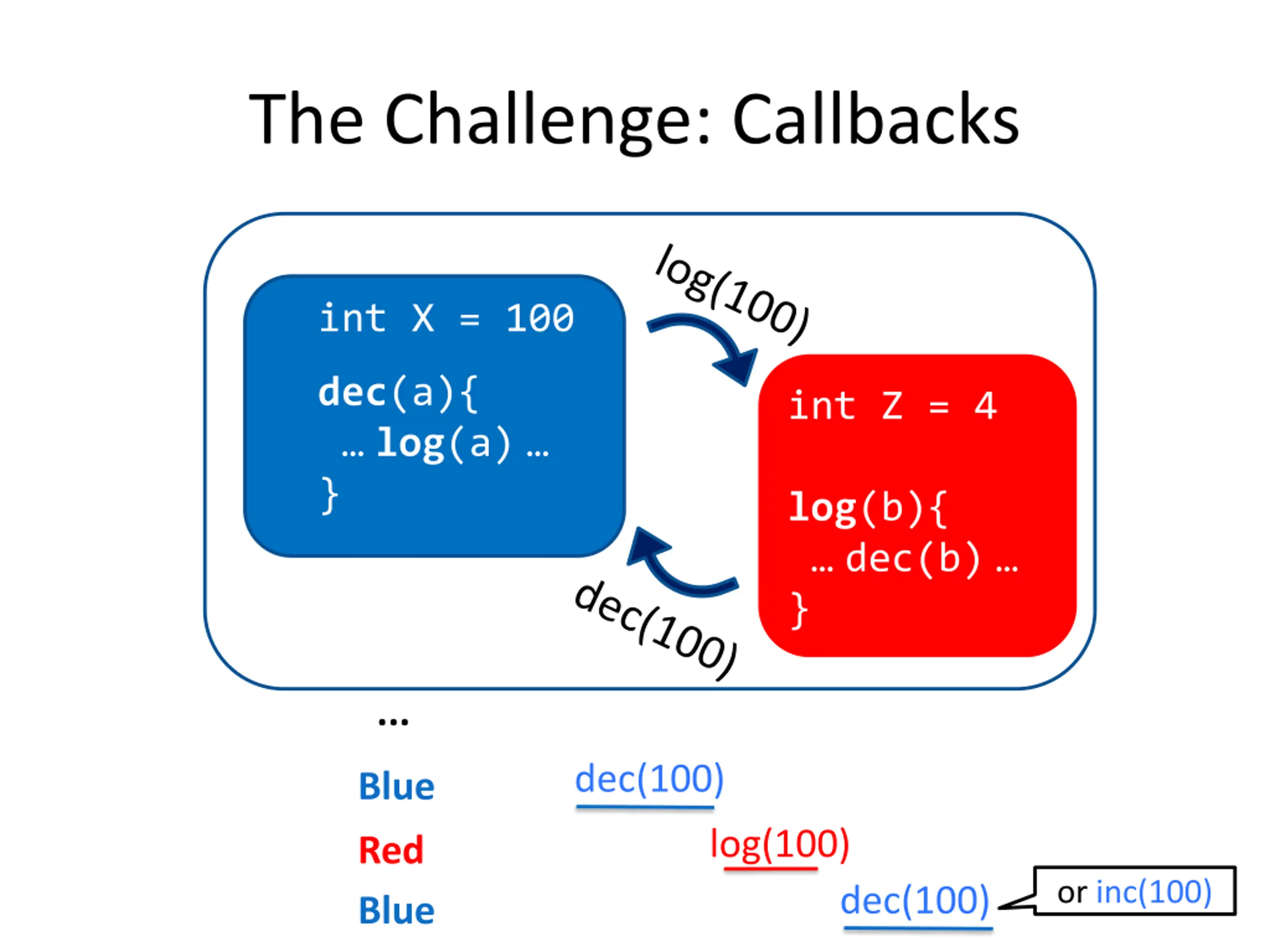 The Challenge: Callbacks int X = 100 dec(a){ log(a) } int Z = 4 log(b){ dec(b) } ... dec(100) Blue log(100) Red Blue or inc(100) dec(100)