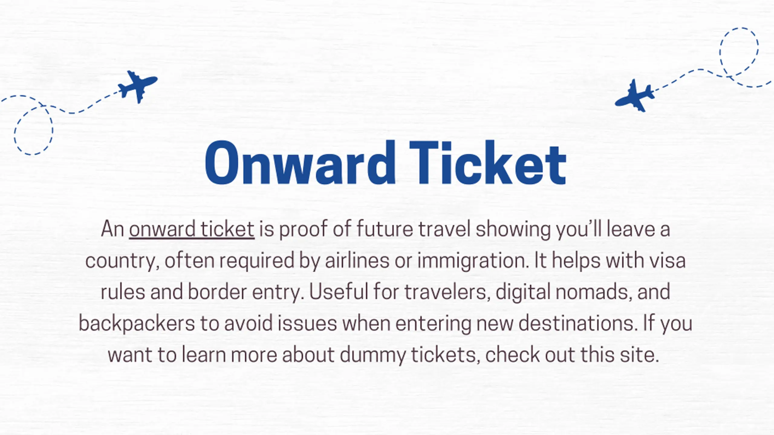 Onward Ticket An onward ticket is proof of future travel showing you ll leave a country, often required by airlines or immigration. It helps with visa rules and border entry. Useful for travelers, digital nomads, and backpackers to avoid issues when entering new destinations. If you want to learn more about dummy tickets, check out this site.