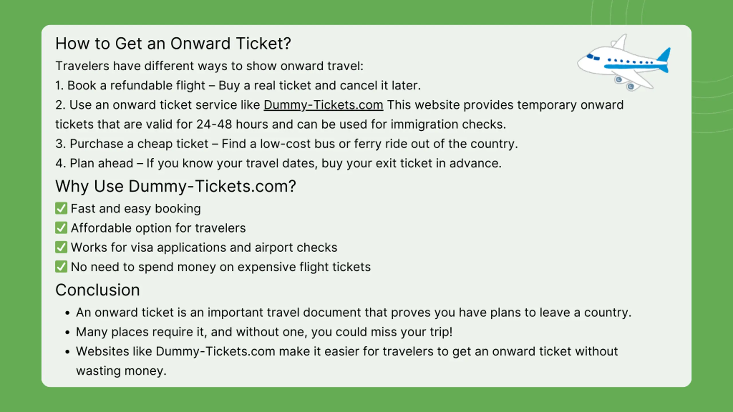 How to Get an Onward Ticket? Travelers have different ways to show onward travel: 1. Book a refundable flight Buy a real ticket and cancel it later. 2. Use an onward ticket service like Dummy-Tickets.com This website provides temporary onward tickets that are valid for 24-48 hours and can be used for immigration checks. 3. Purchase a cheap ticket Find a low-cost bus or ferry ride out of the country. 4. Plan ahead If you know your travel dates, buy your exit ticket in advance. Why Use Dummy-Tickets.com? Fast and easy booking Affordable option for travelers Works for visa applications and airport checks No need to spend money on expensive flight tickets Conclusion An onward ticket is an important travel document that proves you have plans to leave a country. Many places require it, and without one, you could miss your trip! Websites like Dummy-Tickets.com make it easier for travelers to get an onward ticket without wasting money.