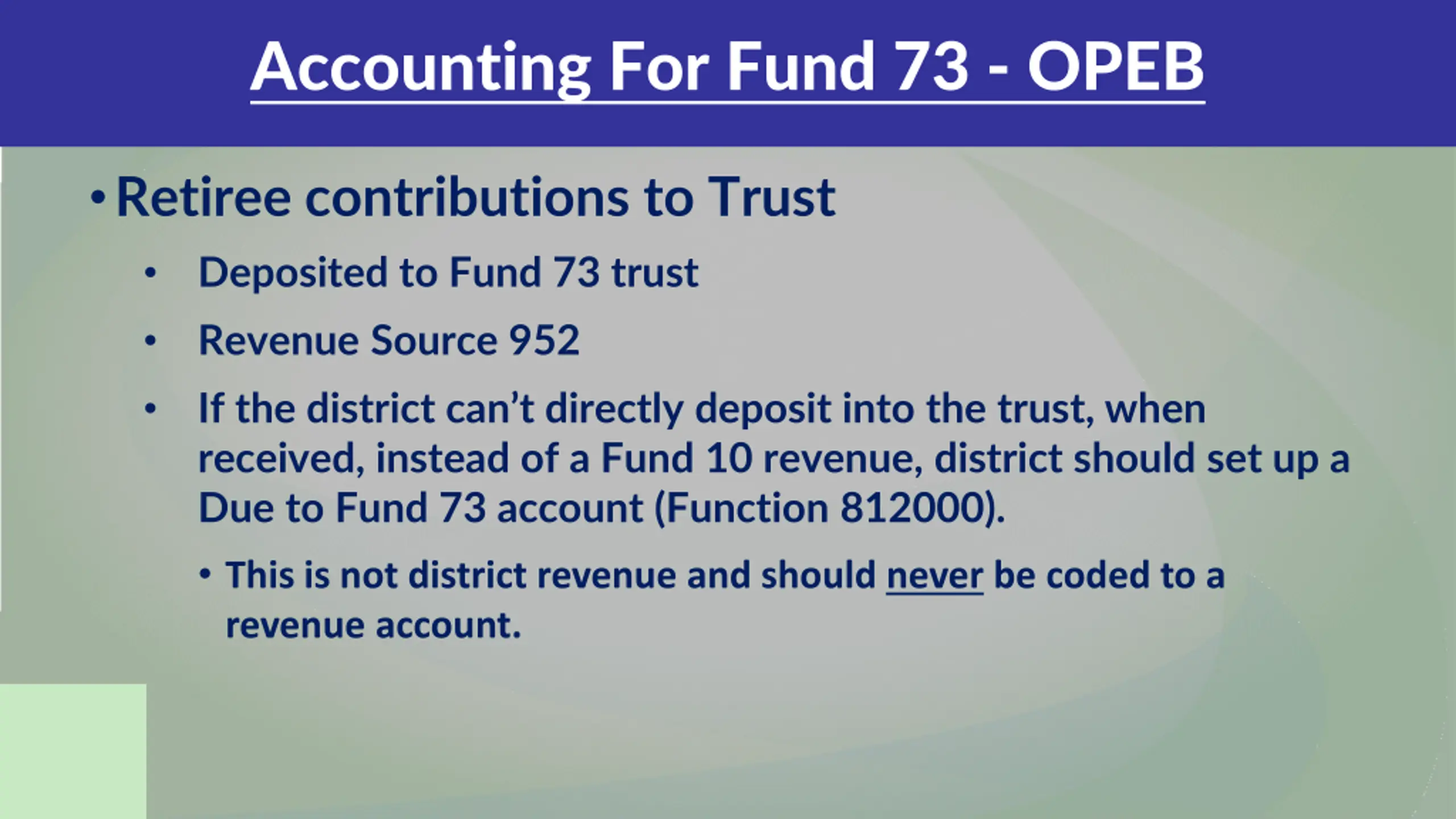 Accounting For Fund 73 - OPEB Retiree contributions to Trust Deposited to Fund 73 trust Revenue Source 952 If the district can t directly deposit into the trust, when received, instead of a Fund 10 revenue, district should set up a Due to Fund 73 account (Function 812000). This is not district revenue and should never be coded to a revenue account.