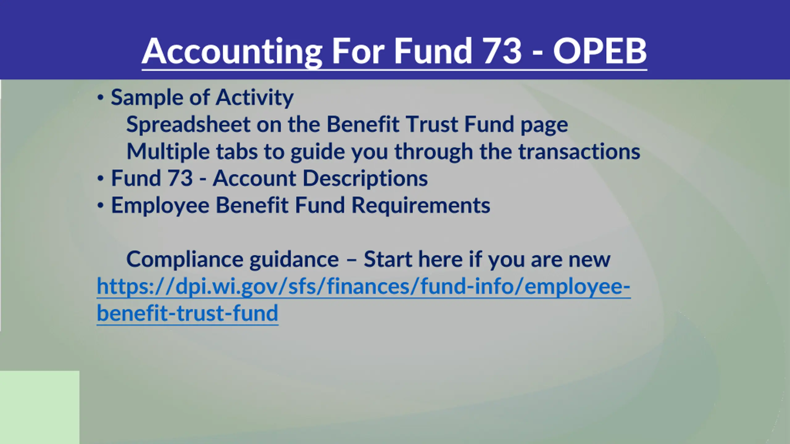 Accounting For Fund 73 - OPEB Sample of Activity Spreadsheet on the Benefit Trust Fund page Multiple tabs to guide you through the transactions Fund 73 - Account Descriptions Employee Benefit Fund Requirements Compliance guidance Start here if you are new https://dpi.wi.gov/sfs/finances/fund-info/employee- benefit-trust-fund