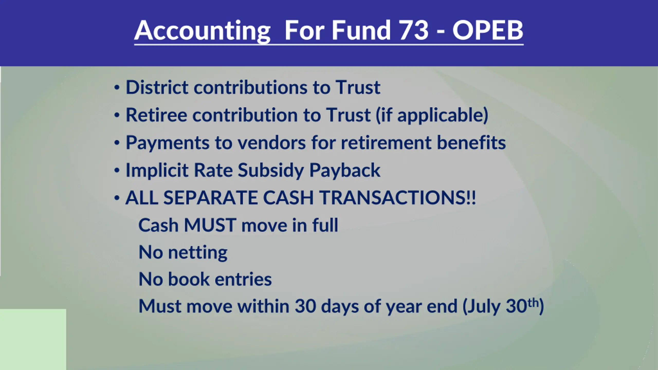 Accounting For Fund 73 - OPEB District contributions to Trust Retiree contribution to Trust (if applicable) Payments to vendors for retirement benefits Implicit Rate Subsidy Payback ALL SEPARATE CASH TRANSACTIONS!! Cash MUST move in full No netting No book entries Must move within 30 days of year end (July 30th)
