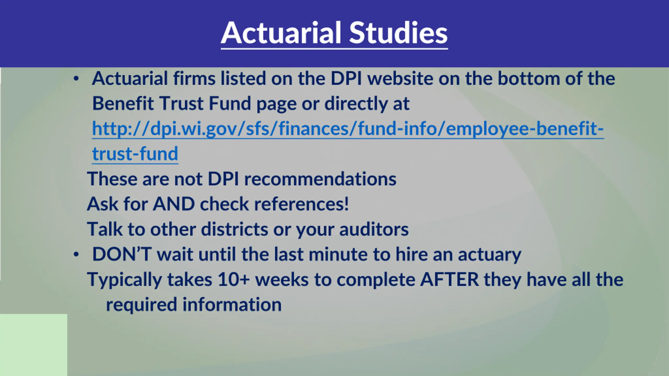 Actuarial Studies Actuarial firms listed on the DPI website on the bottom of the Benefit Trust Fund page or directly at http://dpi.wi.gov/sfs/finances/fund-info/employee-benefit- trust-fund These are not DPI recommendations Ask for AND check references! Talk to other districts or your auditors DON T wait until the last minute to hire an actuary Typically takes 10+ weeks to complete AFTER they have all the required information