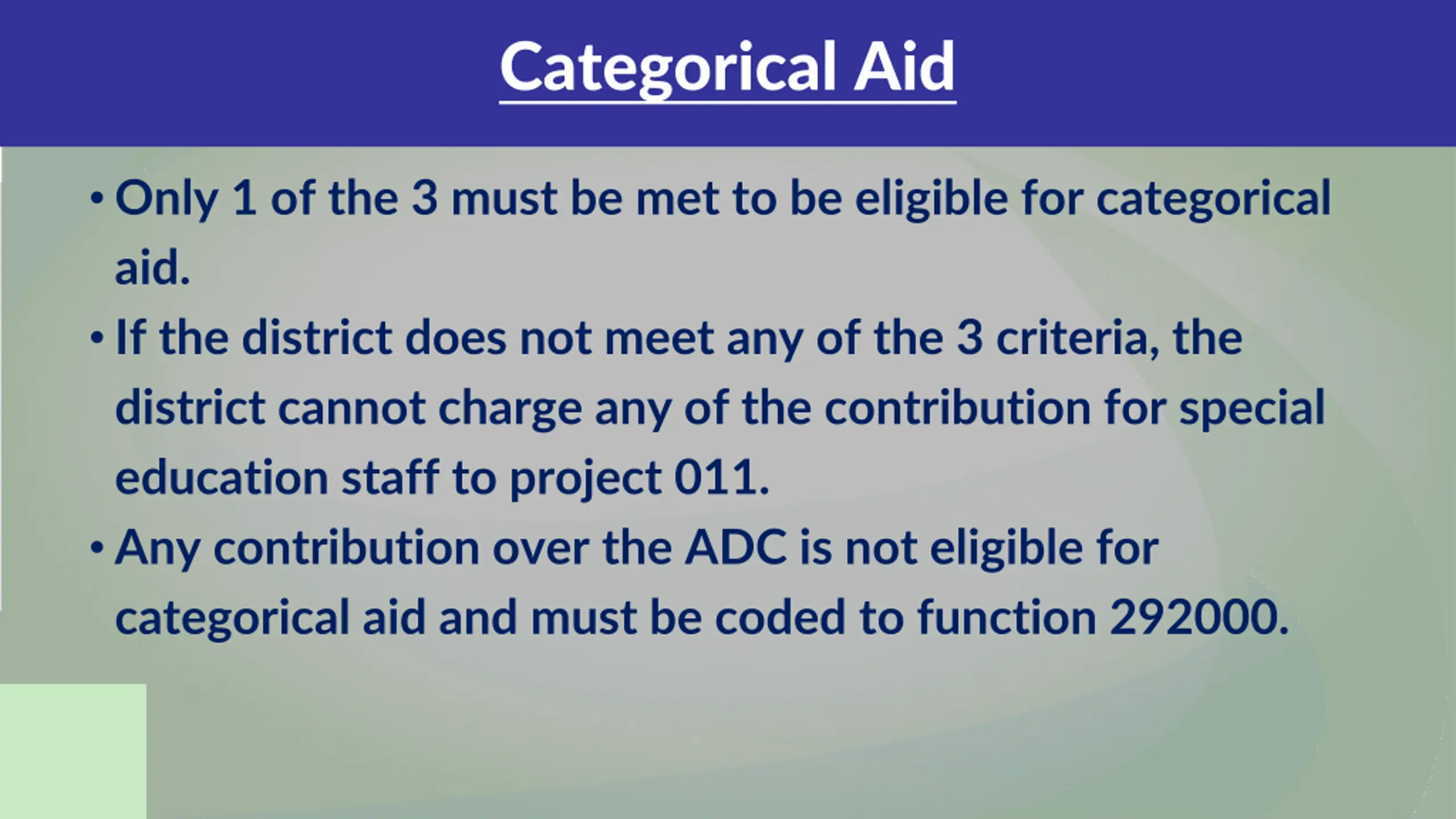 Categorical Aid Only 1 of the 3 must be met to be eligible for categorical aid. If the district does not meet any of the 3 criteria, the district cannot charge any of the contribution for special education staff to project 011. Any contribution over the ADC is not eligible for categorical aid and must be coded to function 292000.