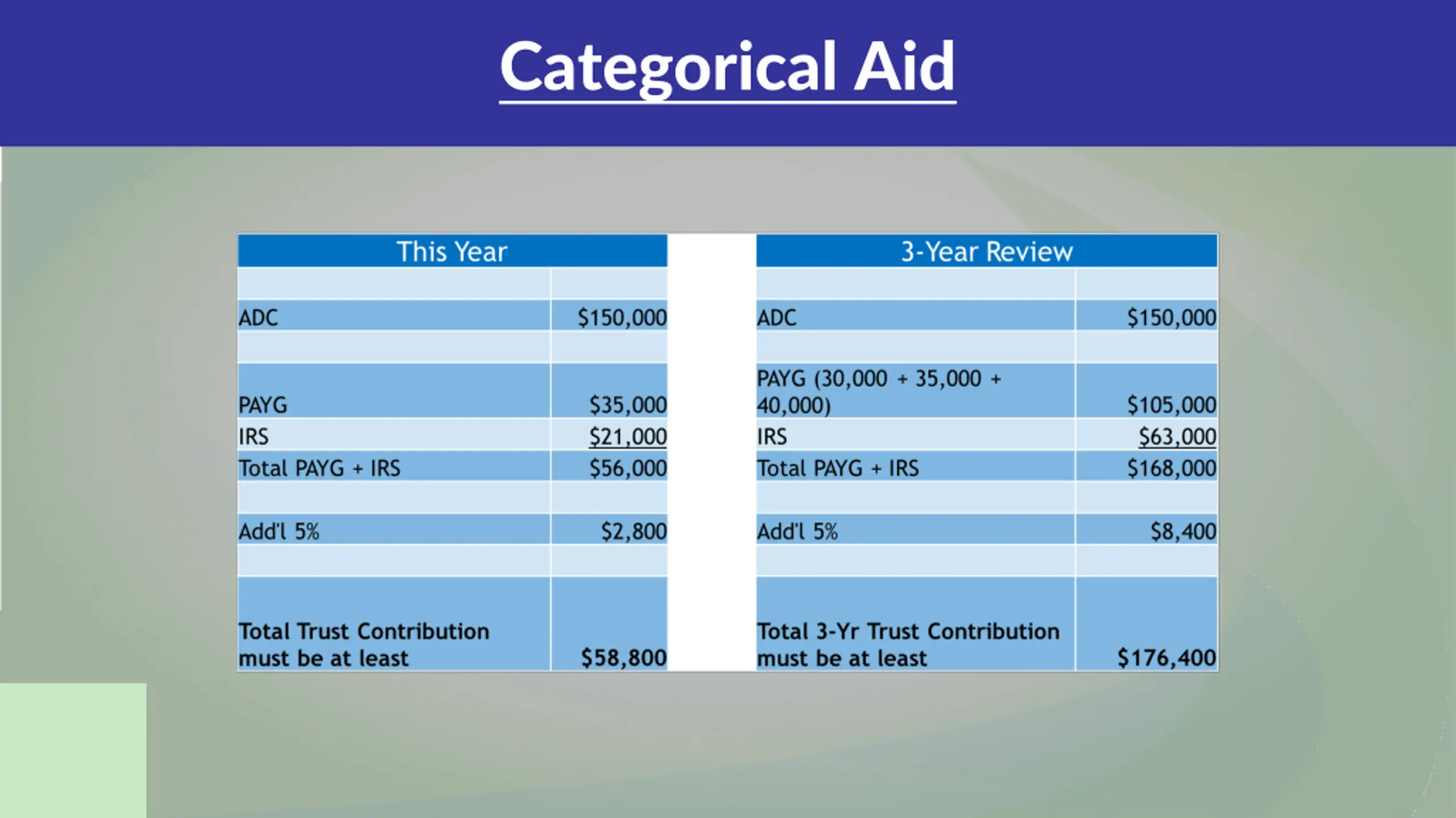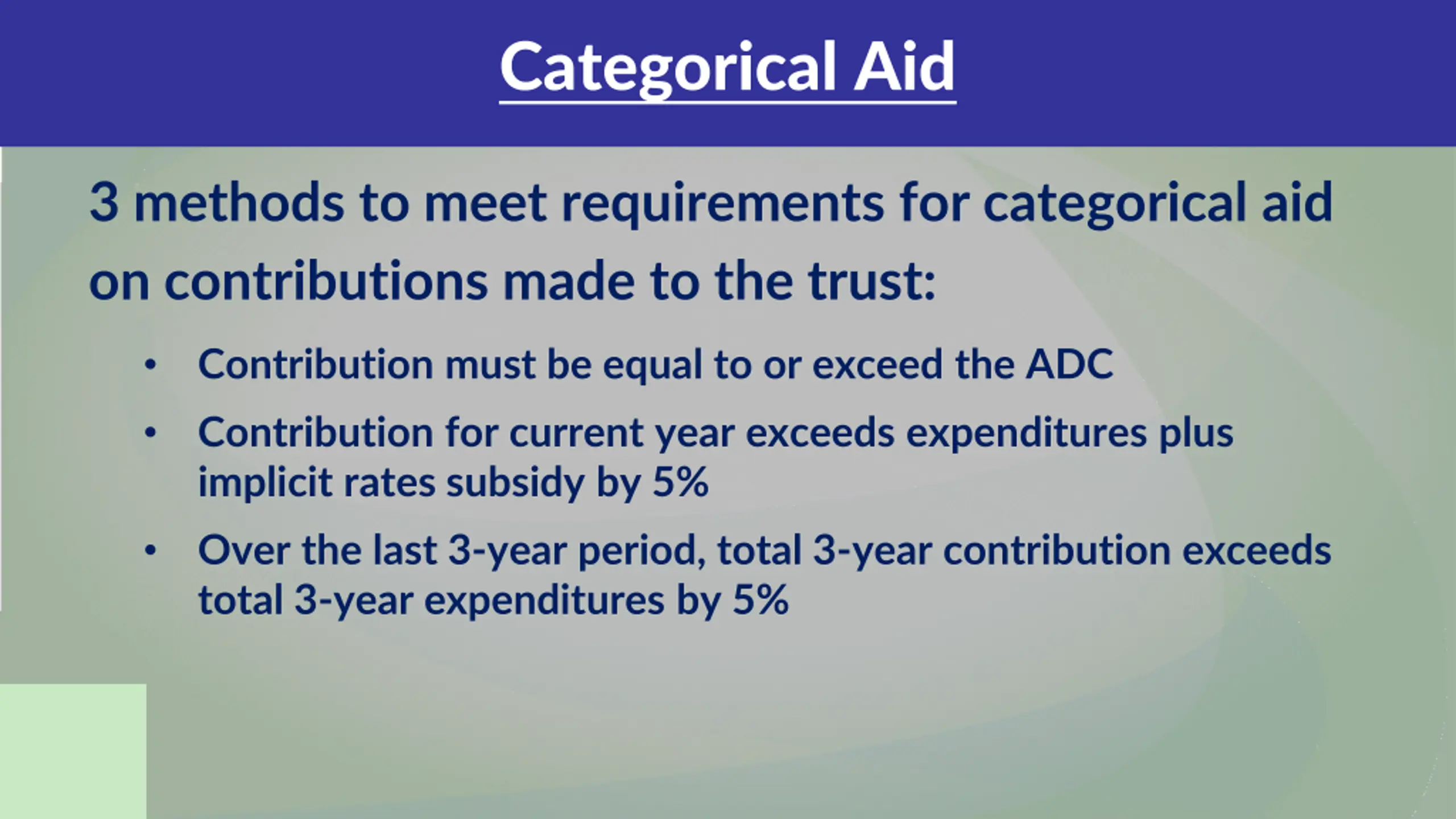 Categorical Aid 3 methods to meet requirements for categorical aid on contributions made to the trust: Contribution must be equal to or exceed the ADC Contribution for current year exceeds expenditures plus implicit rates subsidy by 5% Over the last 3-year period, total 3-year contribution exceeds total 3-year expenditures by 5%