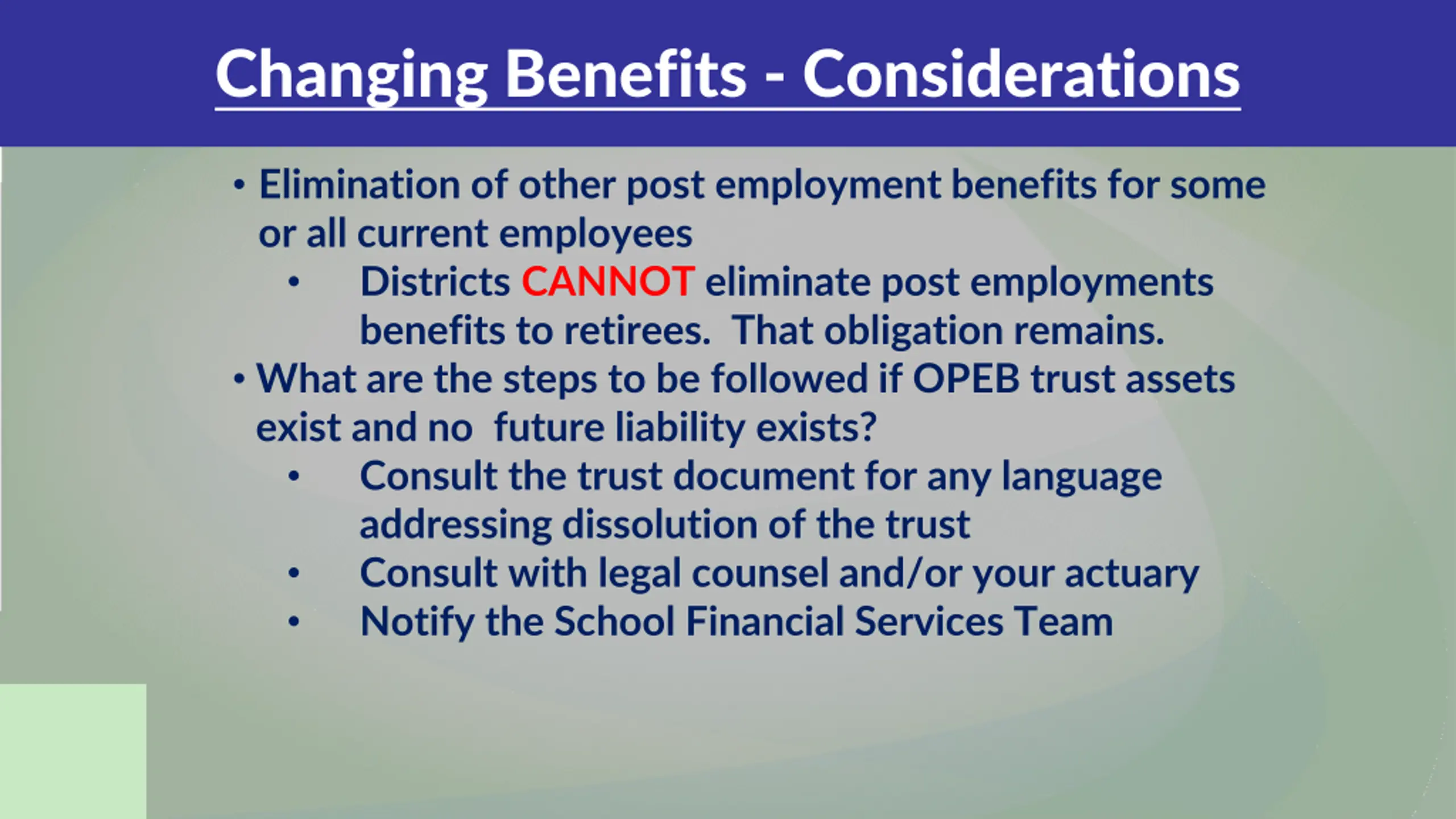 Changing Benefits - Considerations Elimination of other post employment benefits for some or all current employees Districts CANNOT eliminate post employments benefits to retirees. That obligation remains. What are the steps to be followed if OPEB trust assets exist and no future liability exists? Consult the trust document for any language addressing dissolution of the trust Consult with legal counsel and/or your actuary Notify the School Financial Services Team