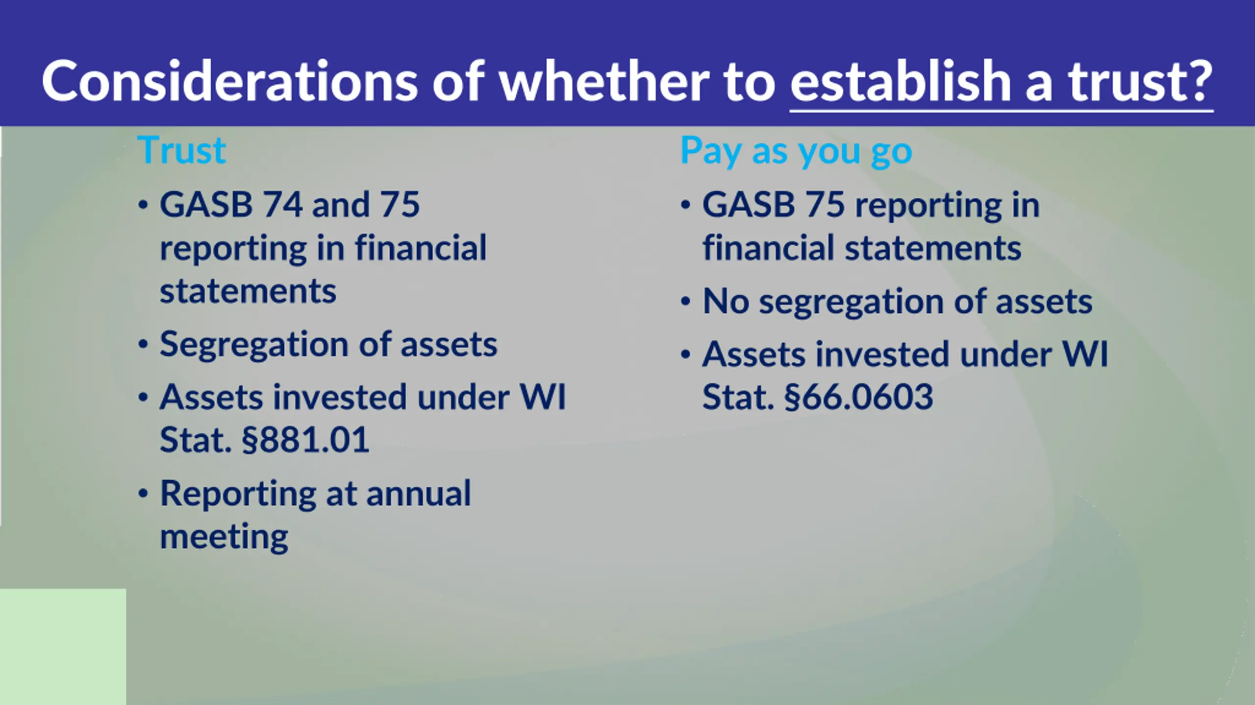 Considerations of whether to establish a trust? Trust GASB 74 and 75 reporting in financial statements Segregation of assets Assets invested under WI Stat. 881.01 Reporting at annual meeting Pay as you go GASB 75 reporting in financial statements No segregation of assets Assets invested under WI Stat. 66.0603