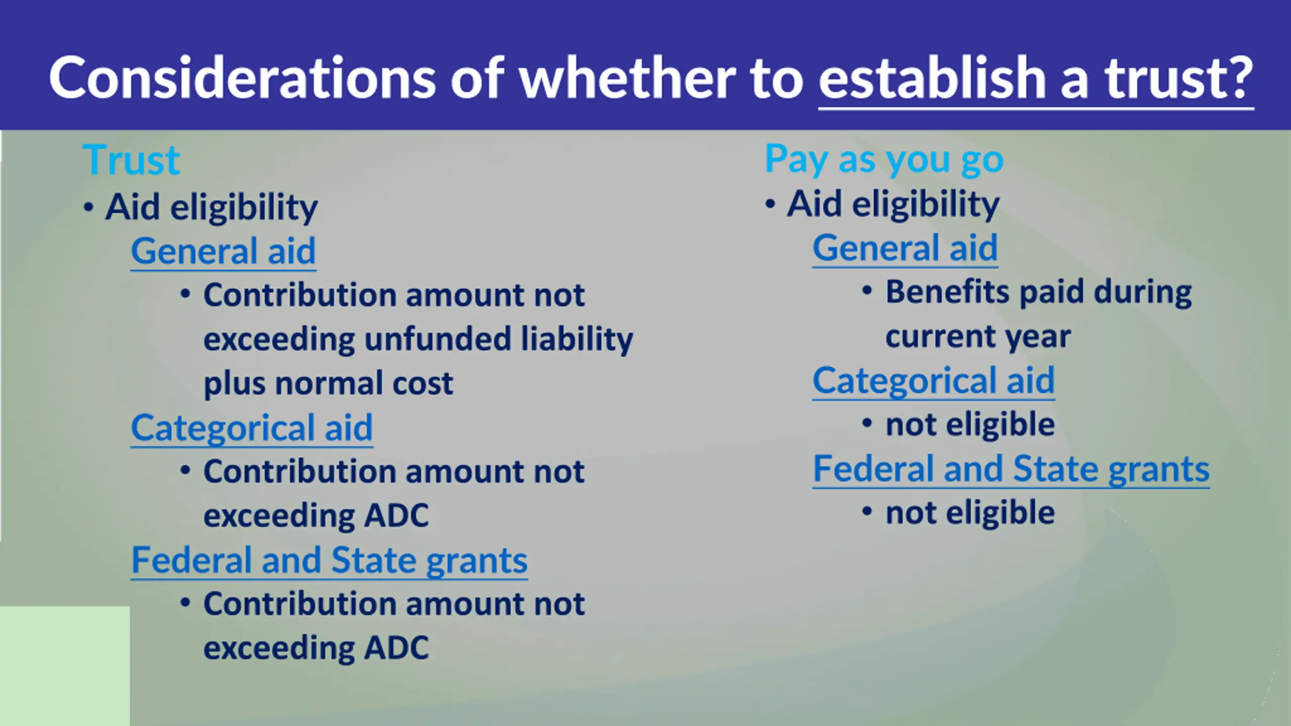 Considerations of whether to establish a trust? Pay as you go Aid eligibility General aid Benefits paid during current year Categorical aid not eligible Federal and State grants not eligible Trust Aid eligibility General aid Contribution amount not exceeding unfunded liability plus normal cost Categorical aid Contribution amount not exceeding ADC Federal and State grants Contribution amount not exceeding ADC