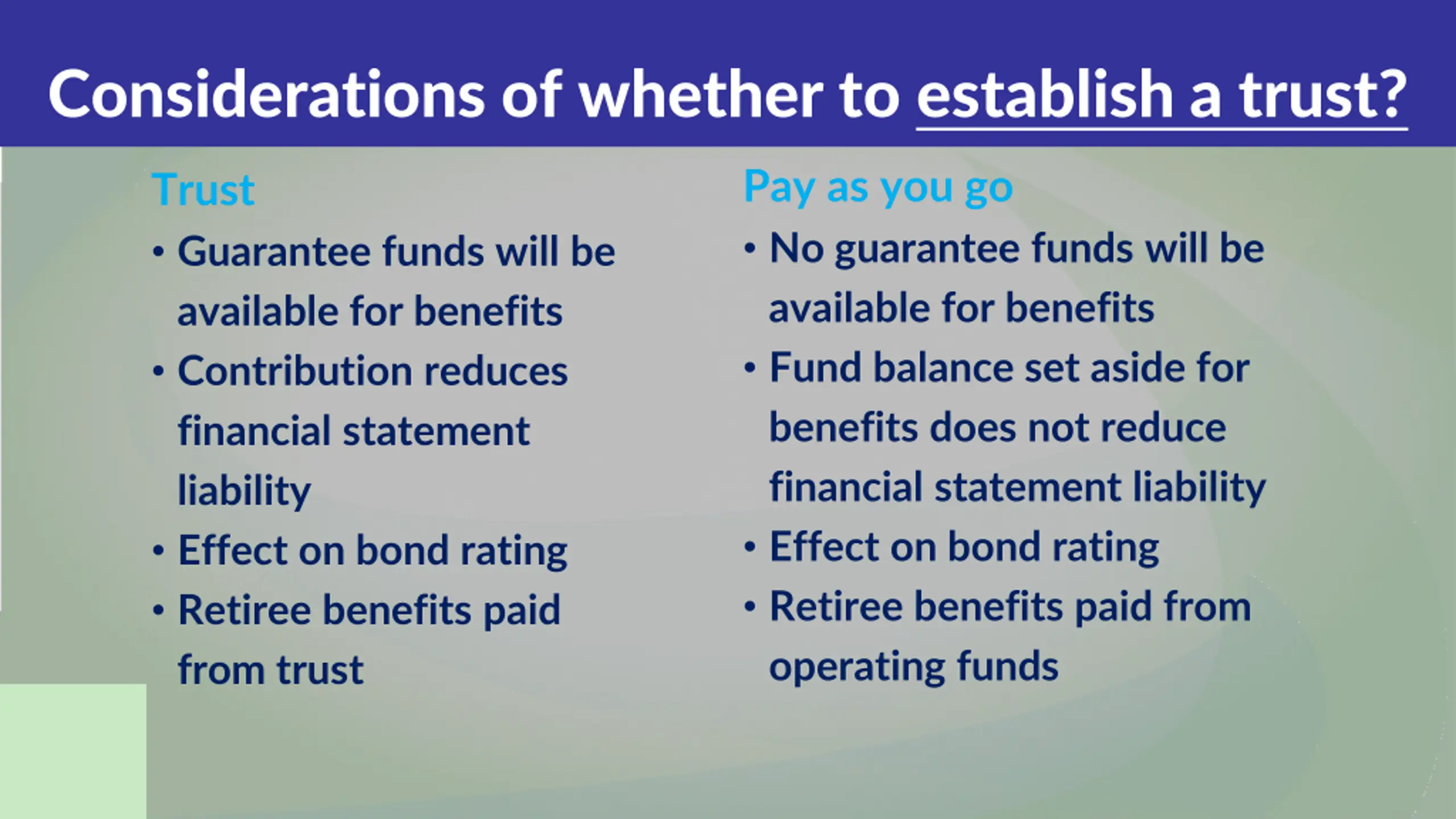 Considerations of whether to establish a trust? Pay as you go No guarantee funds will be available for benefits Fund balance set aside for benefits does not reduce financial statement liability Effect on bond rating Retiree benefits paid from operating funds Trust Guarantee funds will be available for benefits Contribution reduces financial statement liability Effect on bond rating Retiree benefits paid from trust