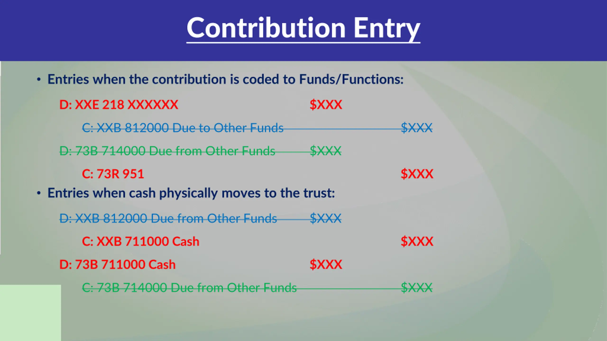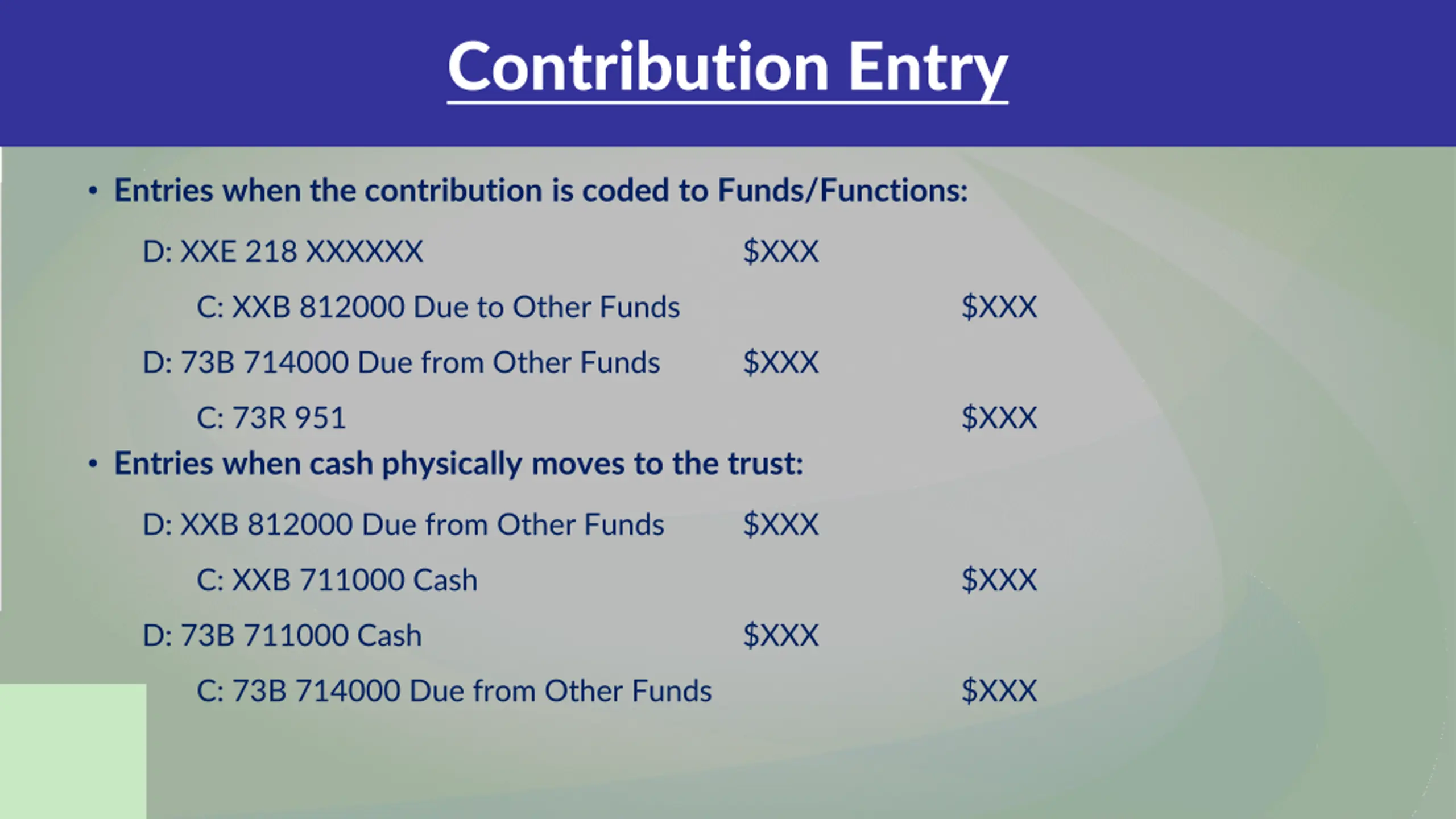 Contribution Entry Entries when the contribution is coded to Funds/Functions: D: XXE 218 XXXXXX $XXX C: XXB 812000 Due to Other Funds $XXX D: 73B 714000 Due from Other Funds $XXX C: 73R 951 $XXX Entries when cash physically moves to the trust: D: XXB 812000 Due from Other Funds $XXX C: XXB 711000 Cash $XXX D: 73B 711000 Cash $XXX C: 73B 714000 Due from Other Funds $XXX