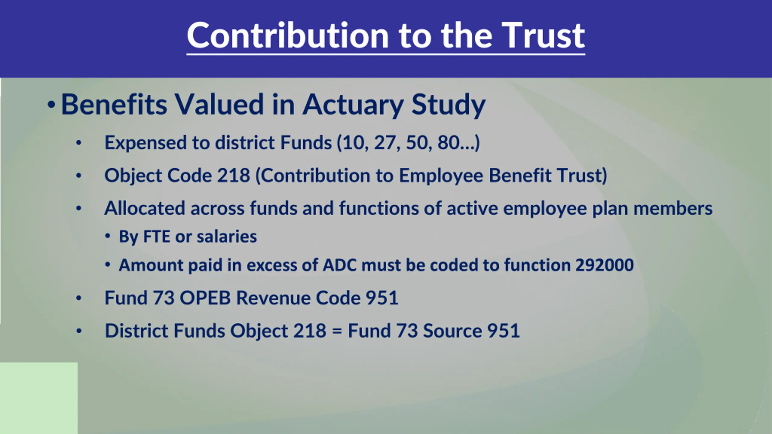 Contribution to the Trust Benefits Valued in Actuary Study Expensed to district Funds (10, 27, 50, 80 ) Object Code 218 (Contribution to Employee Benefit Trust) Allocated across funds and functions of active employee plan members By FTE or salaries Amount paid in excess of ADC must be coded to function 292000 Fund 73 OPEB Revenue Code 951 District Funds Object 218 = Fund 73 Source 951