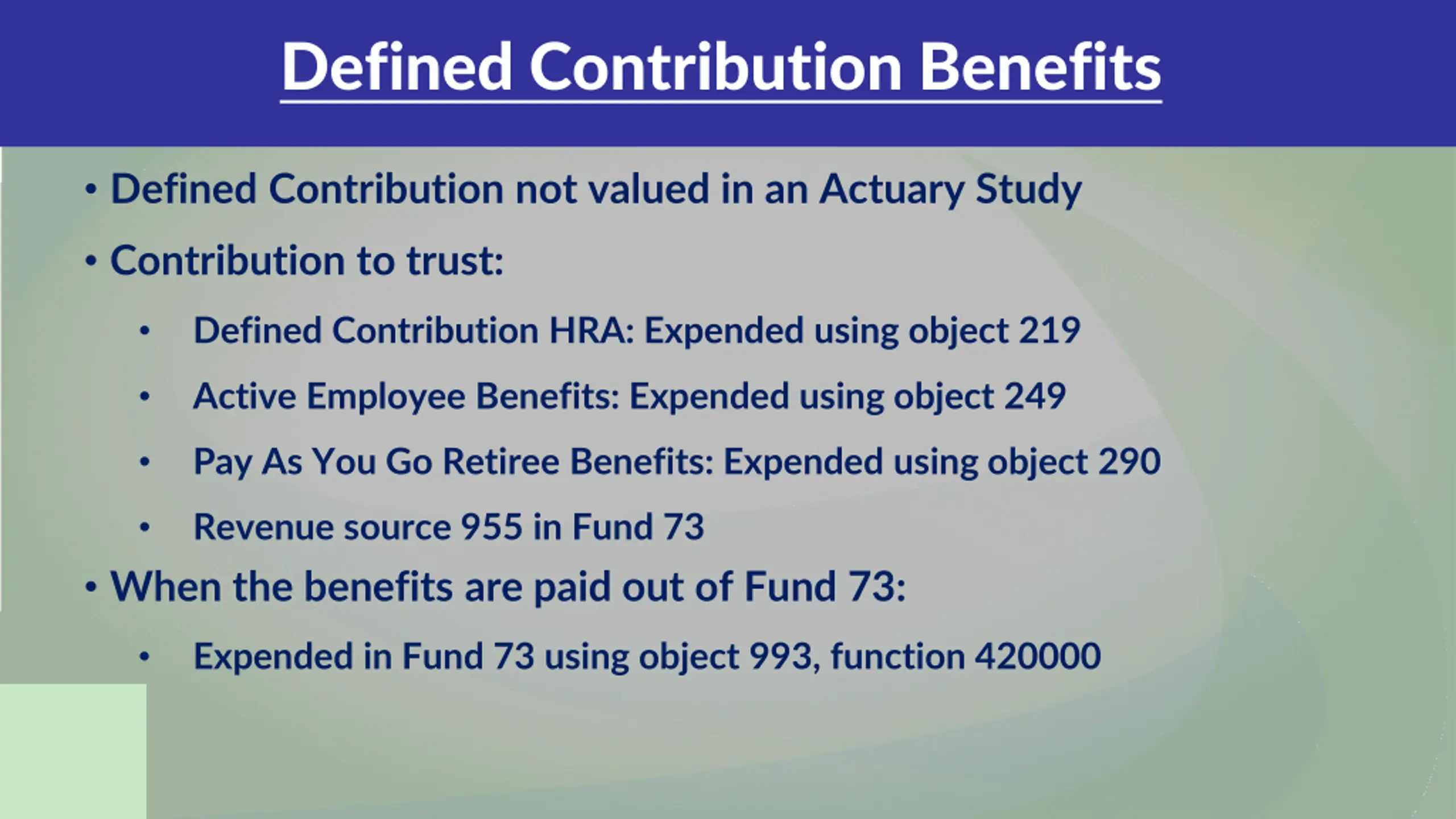 Defined Contribution Benefits Defined Contribution not valued in an Actuary Study Contribution to trust: Defined Contribution HRA: Expended using object 219 Active Employee Benefits: Expended using object 249 Pay As You Go Retiree Benefits: Expended using object 290 Revenue source 955 in Fund 73 When the benefits are paid out of Fund 73: Expended in Fund 73 using object 993, function 420000