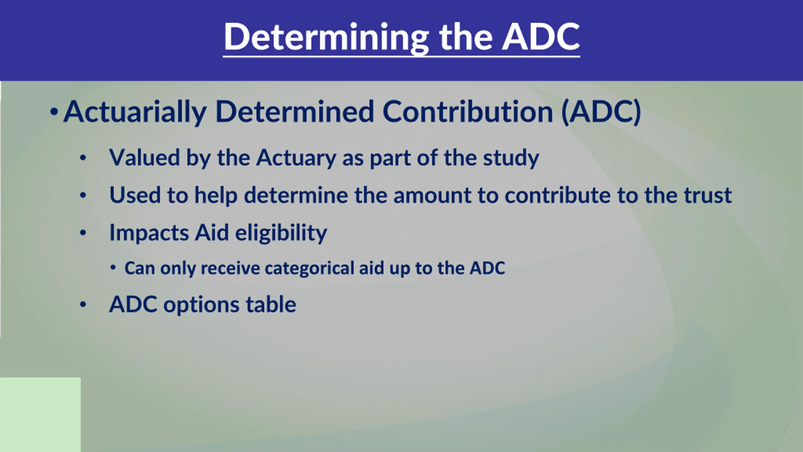 Determining the ADC Actuarially Determined Contribution (ADC) Valued by the Actuary as part of the study Used to help determine the amount to contribute to the trust Impacts Aid eligibility Can only receive categorical aid up to the ADC ADC options table