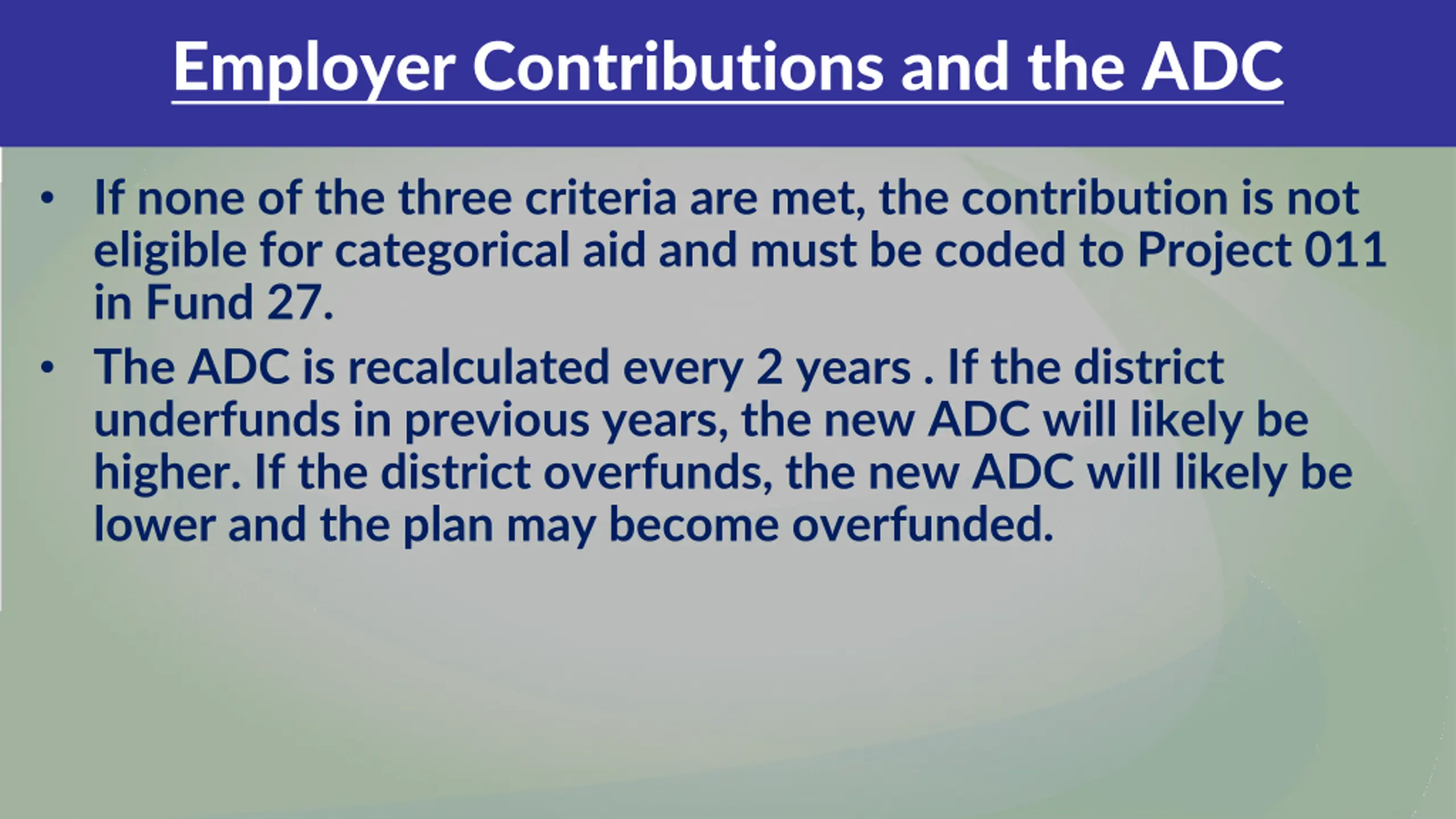 Employer Contributions and the ADC If none of the three criteria are met, the contribution is not eligible for categorical aid and must be coded to Project 011 in Fund 27. The ADC is recalculated every 2 years . If the district underfunds in previous years, the new ADC will likely be higher. If the district overfunds, the new ADC will likely be lower and the plan may become overfunded.