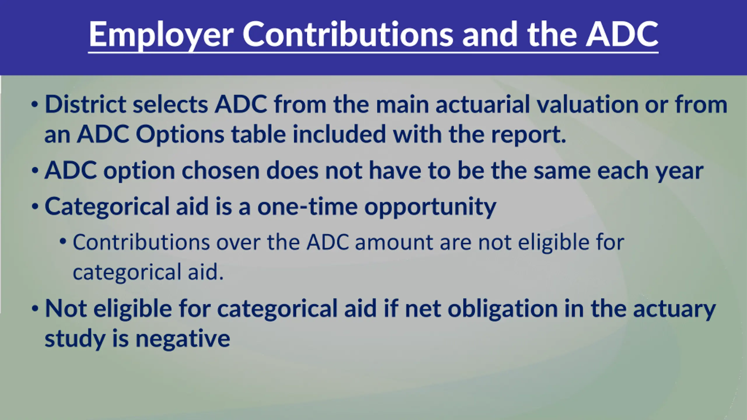 Employer Contributions and the ADC District selects ADC from the main actuarial valuation or from an ADC Options table included with the report. ADC option chosen does not have to be the same each year Categorical aid is a one-time opportunity Contributions over the ADC amount are not eligible for categorical aid. Not eligible for categorical aid if net obligation in the actuary study is negative