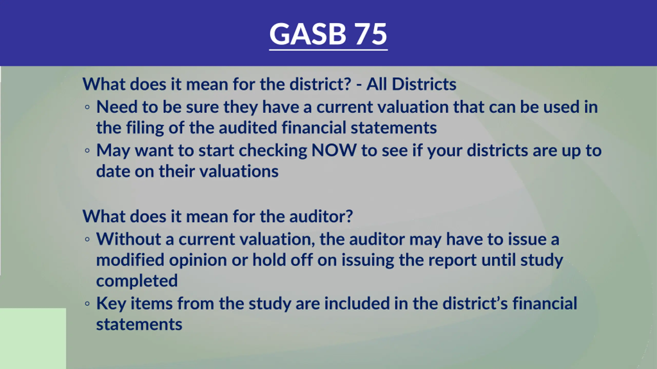 GASB 75 What does it mean for the district? - All Districts Need to be sure they have a current valuation that can be used in the filing of the audited financial statements May want to start checking NOW to see if your districts are up to date on their valuations What does it mean for the auditor? Without a current valuation, the auditor may have to issue a modified opinion or hold off on issuing the report until study completed Key items from the study are included in the district s financial statements