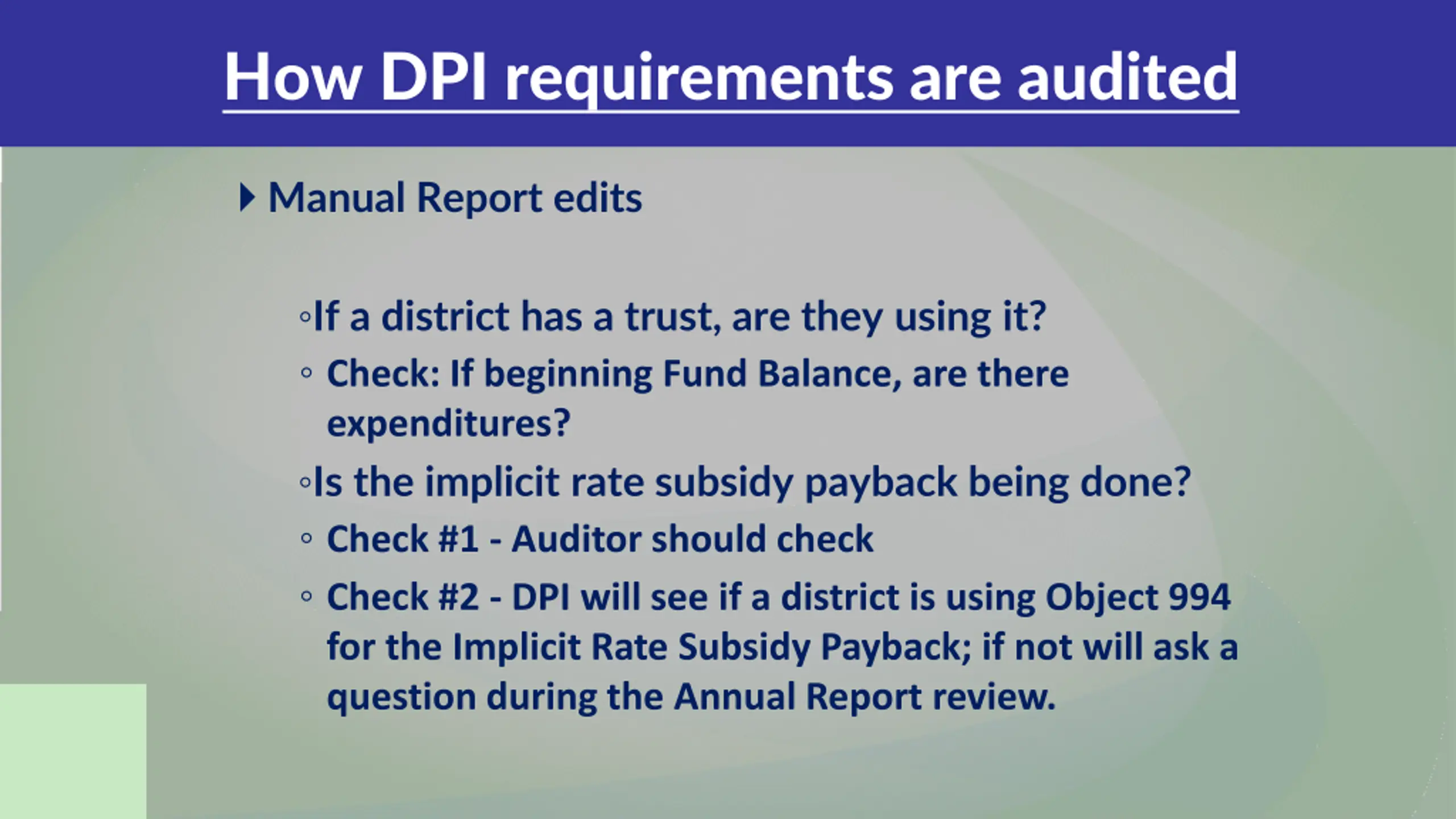 How DPI requirements are audited Manual Report edits If a district has a trust, are they using it? Check: If beginning Fund Balance, are there expenditures? Is the implicit rate subsidy payback being done? Check #1 - Auditor should check Check #2 - DPI will see if a district is using Object 994 for the Implicit Rate Subsidy Payback; if not will ask a question during the Annual Report review.