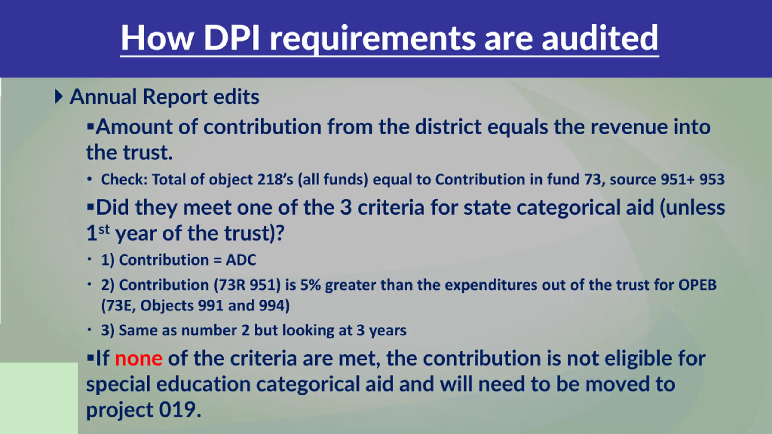 How DPI requirements are audited Annual Report edits Amount of contribution from the district equals the revenue into the trust. Check: Total of object 218 s (all funds) equal to Contribution in fund 73, source 951+ 953 Did they meet one of the 3 criteria for state categorical aid (unless 1st year of the trust)? 1) Contribution = ADC 2) Contribution (73R 951) is 5% greater than the expenditures out of the trust for OPEB (73E, Objects 991 and 994) 3) Same as number 2 but looking at 3 years If none of the criteria are met, the contribution is not eligible for special education categorical aid and will need to be moved to project 019.