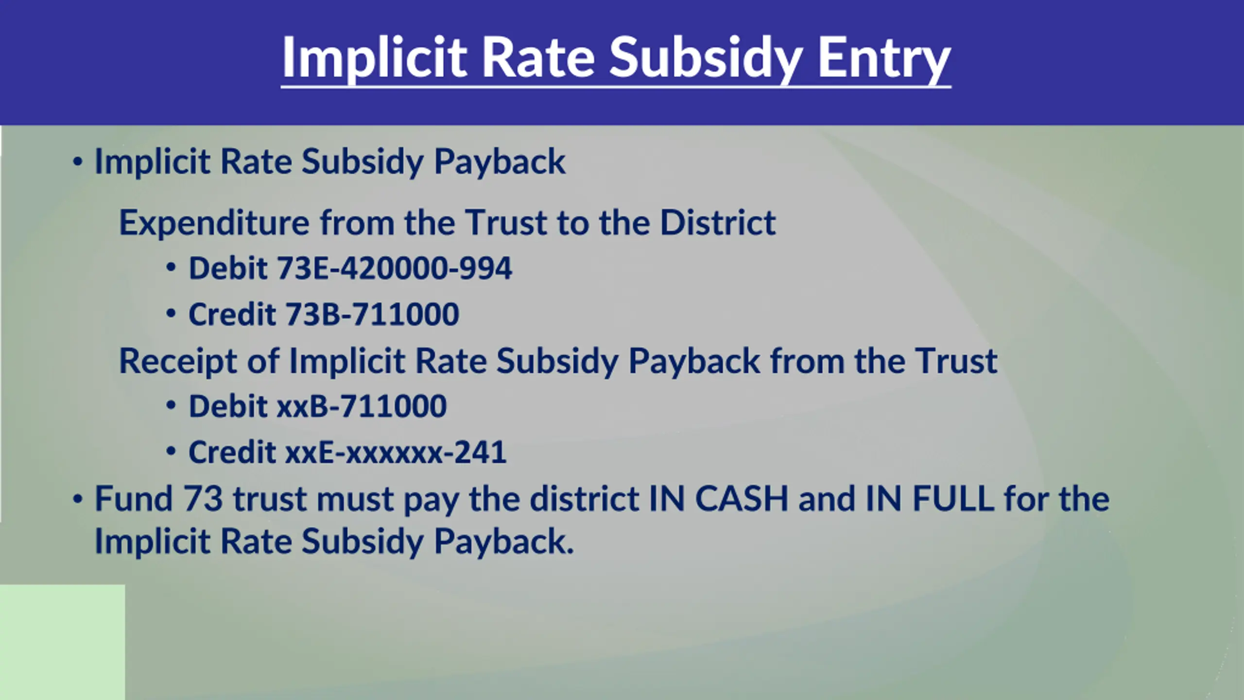 Implicit Rate Subsidy Entry Implicit Rate Subsidy Payback Expenditure from the Trust to the District Debit 73E-420000-994 Credit 73B-711000 Receipt of Implicit Rate Subsidy Payback from the Trust Debit xxB-711000 Credit xxE-xxxxxx-241 Fund 73 trust must pay the district IN CASH and IN FULL for the Implicit Rate Subsidy Payback.