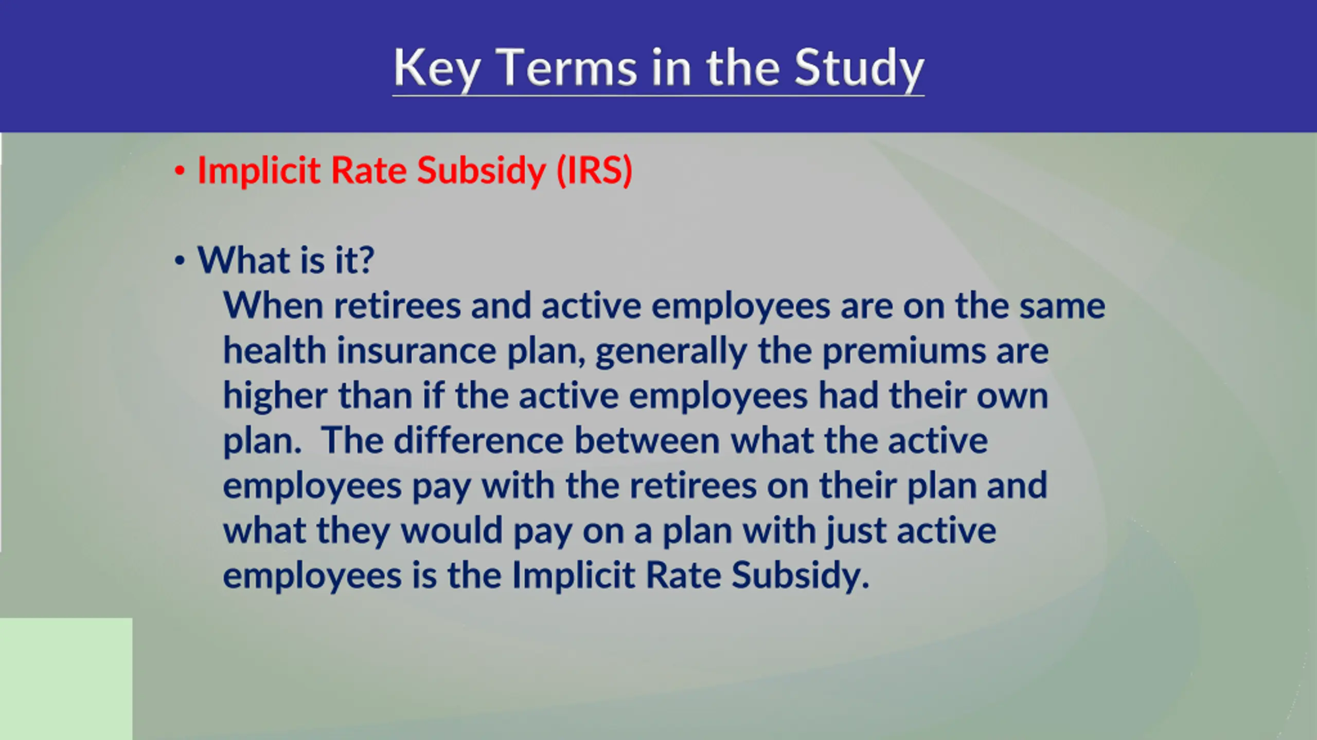 Implicit Rate Subsidy (IRS) What is it? When retirees and active employees are on the same health insurance plan, generally the premiums are higher than if the active employees had their own plan. The difference between what the active employees pay with the retirees on their plan and what they would pay on a plan with just active employees is the Implicit Rate Subsidy.