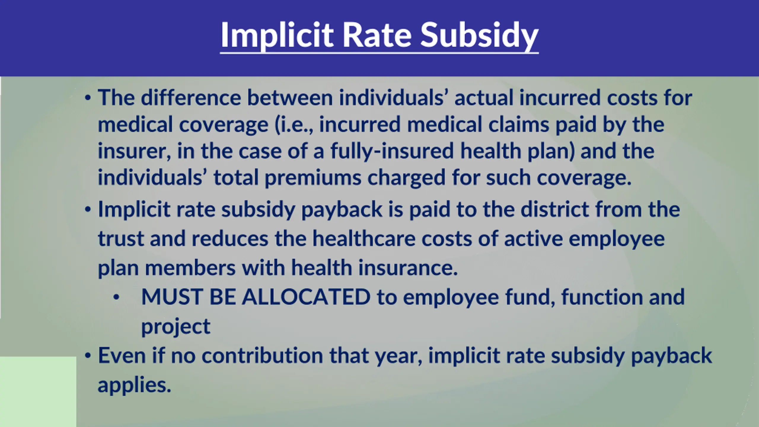 Implicit Rate Subsidy The difference between individuals actual incurred costs for medical coverage (i.e., incurred medical claims paid by the insurer, in the case of a fully-insured health plan) and the individuals total premiums charged for such coverage. Implicit rate subsidy payback is paid to the district from the trust and reduces the healthcare costs of active employee plan members with health insurance. MUST BE ALLOCATED to employee fund, function and project Even if no contribution that year, implicit rate subsidy payback applies.