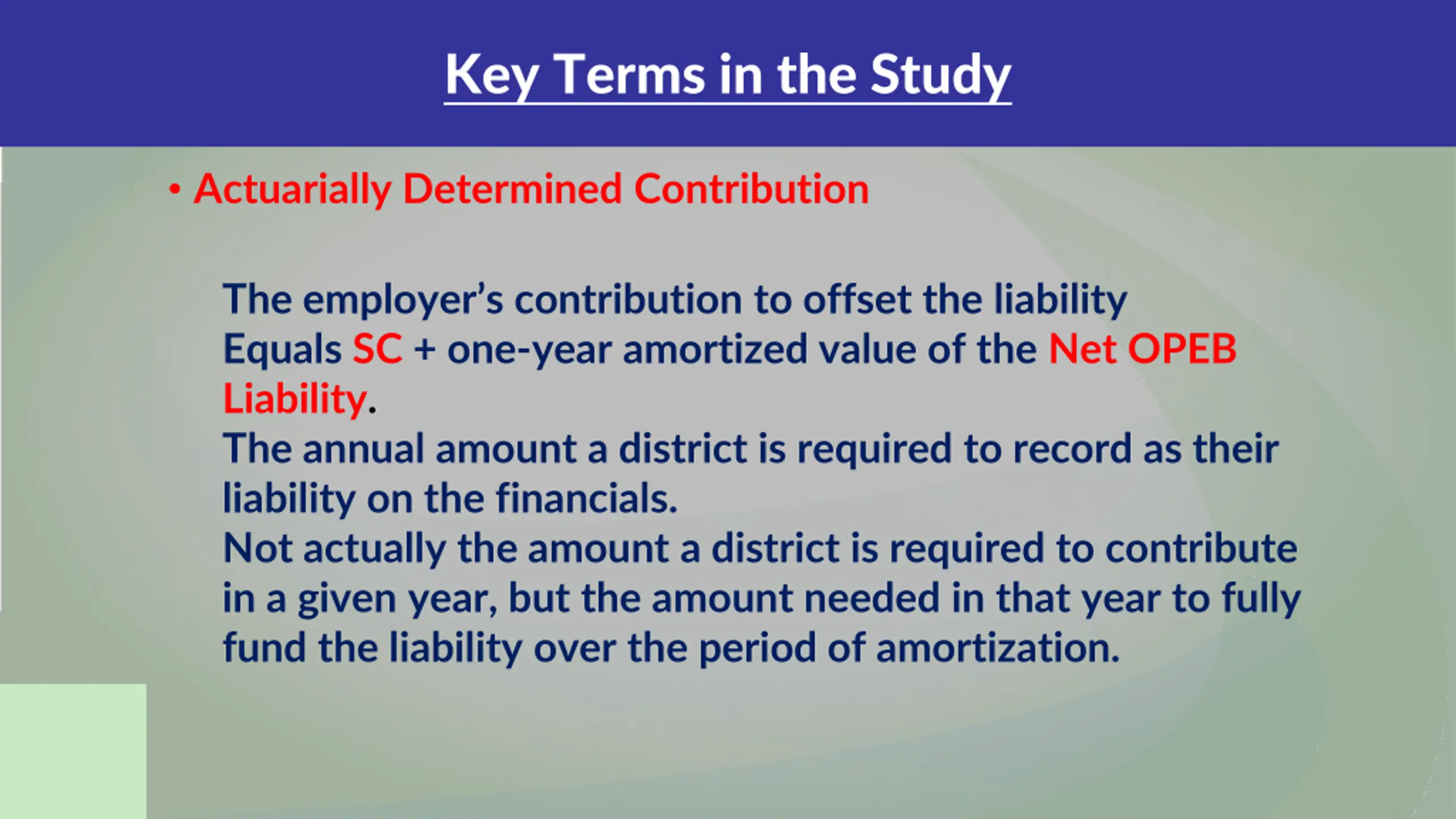 Key Terms in the Study Actuarially Determined Contribution The employer s contribution to offset the liability Equals SC + one-year amortized value of the Net OPEB Liability. The annual amount a district is required to record as their liability on the financials. Not actually the amount a district is required to contribute in a given year, but the amount needed in that year to fully fund the liability over the period of amortization.