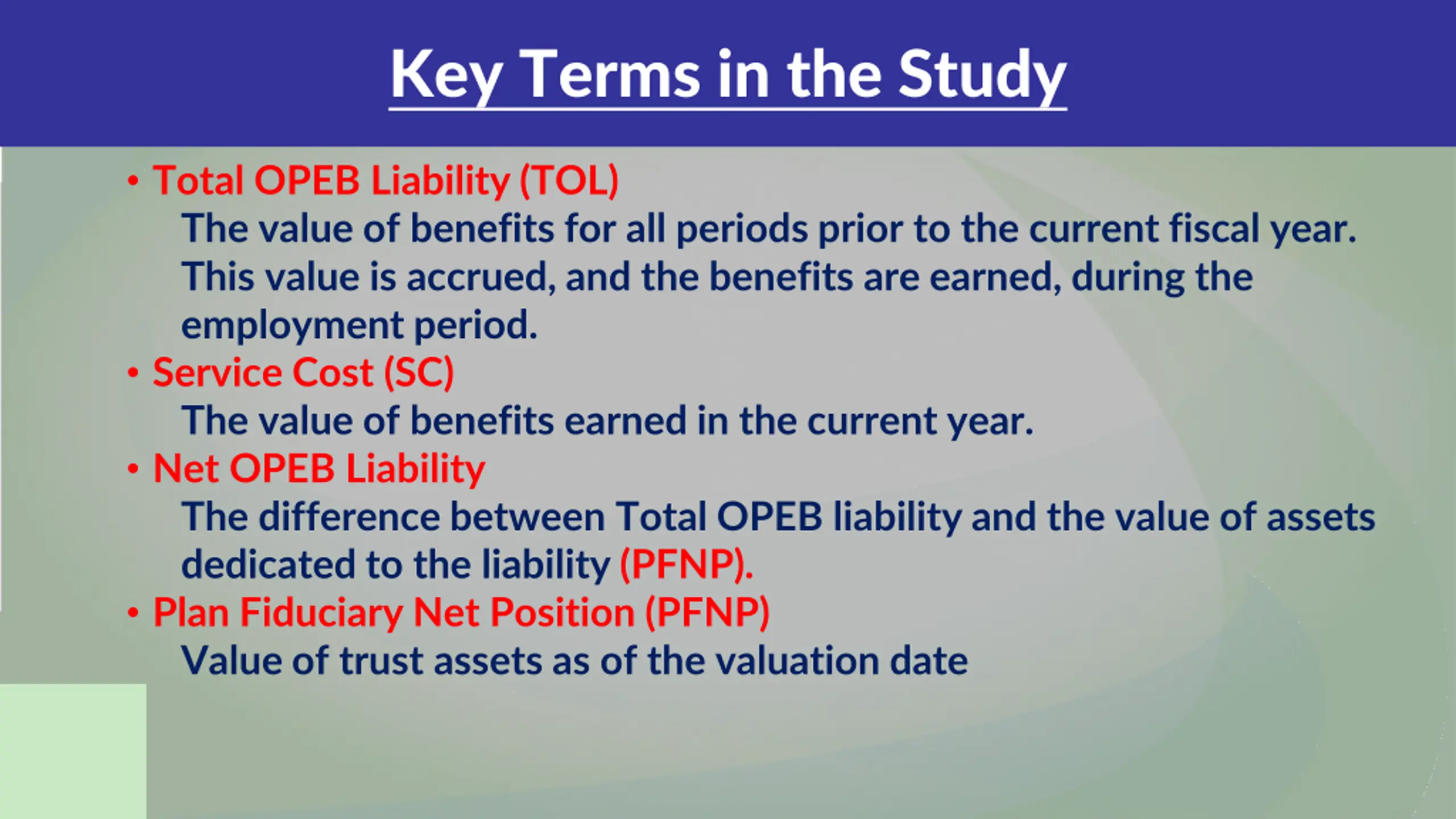 Key Terms in the Study Total OPEB Liability (TOL) The value of benefits for all periods prior to the current fiscal year. This value is accrued, and the benefits are earned, during the employment period. Service Cost (SC) The value of benefits earned in the current year. Net OPEB Liability The difference between Total OPEB liability and the value of assets dedicated to the liability (PFNP). Plan Fiduciary Net Position (PFNP) Value of trust assets as of the valuation date