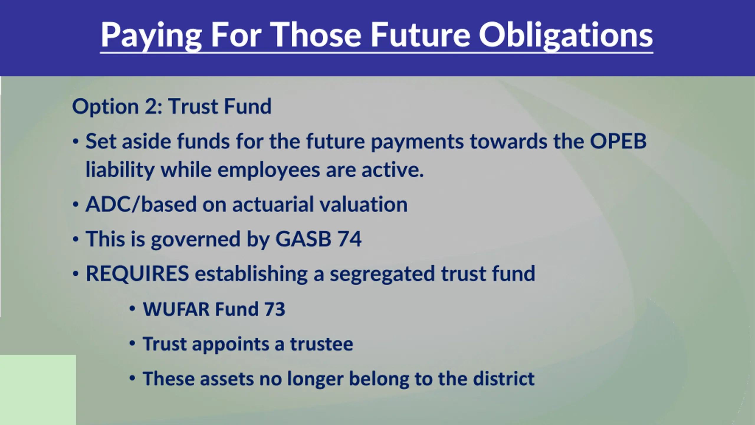 Paying For Those Future Obligations Option 2: Trust Fund Set aside funds for the future payments towards the OPEB liability while employees are active. ADC/based on actuarial valuation This is governed by GASB 74 REQUIRES establishing a segregated trust fund WUFAR Fund 73 Trust appoints a trustee These assets no longer belong to the district