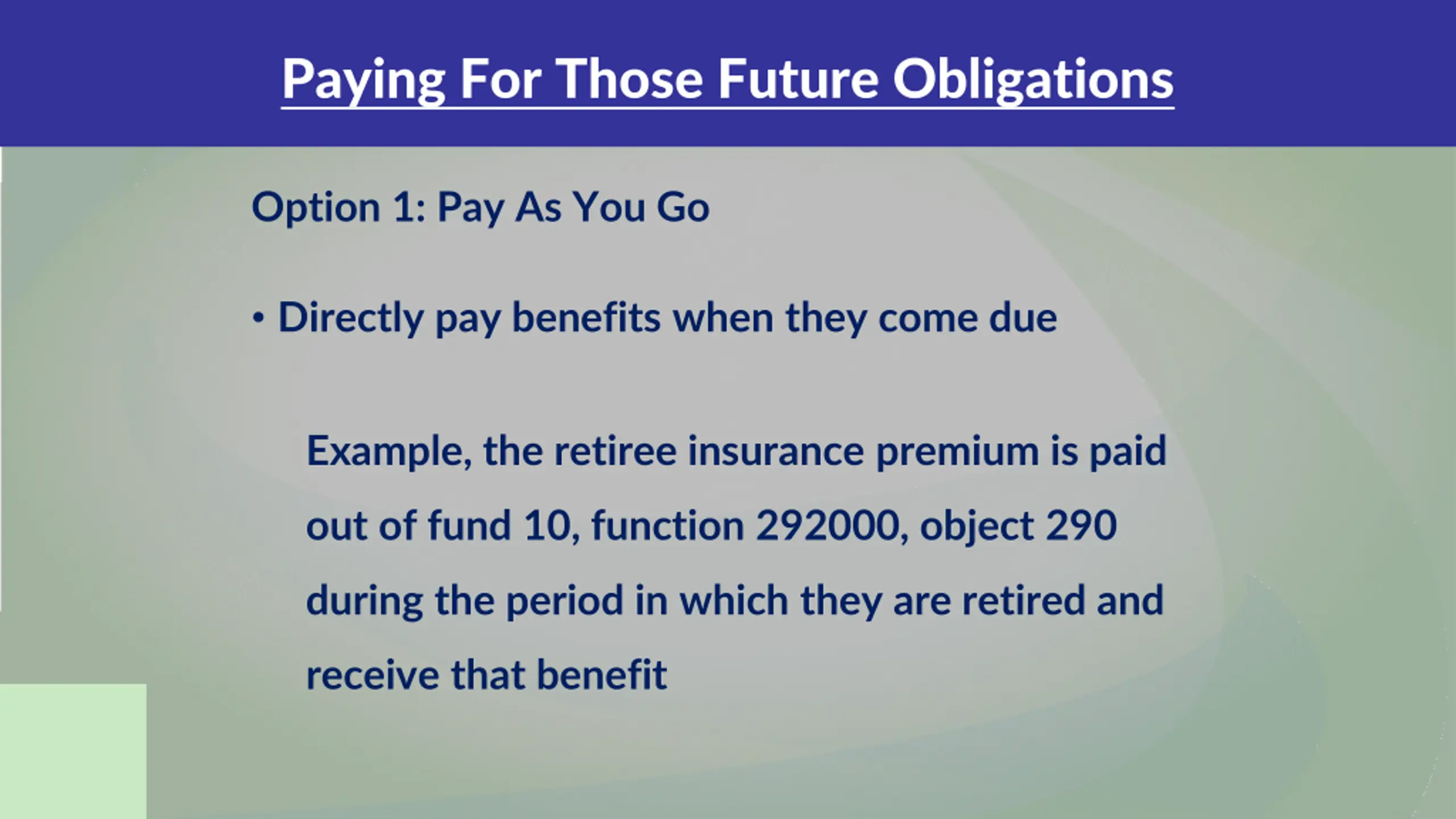 Paying For Those Future Obligations Option 1: Pay As You Go Directly pay benefits when they come due Example, the retiree insurance premium is paid out of fund 10, function 292000, object 290 during the period in which they are retired and receive that benefit