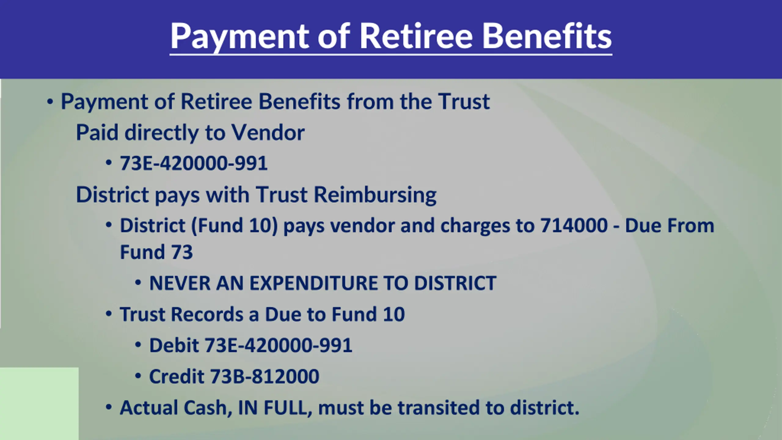 Payment of Retiree Benefits Payment of Retiree Benefits from the Trust Paid directly to Vendor 73E-420000-991 District pays with Trust Reimbursing District (Fund 10) pays vendor and charges to 714000 - Due From Fund 73 NEVER AN EXPENDITURE TO DISTRICT Trust Records a Due to Fund 10 Debit 73E-420000-991 Credit 73B-812000 Actual Cash, IN FULL, must be transited to district.