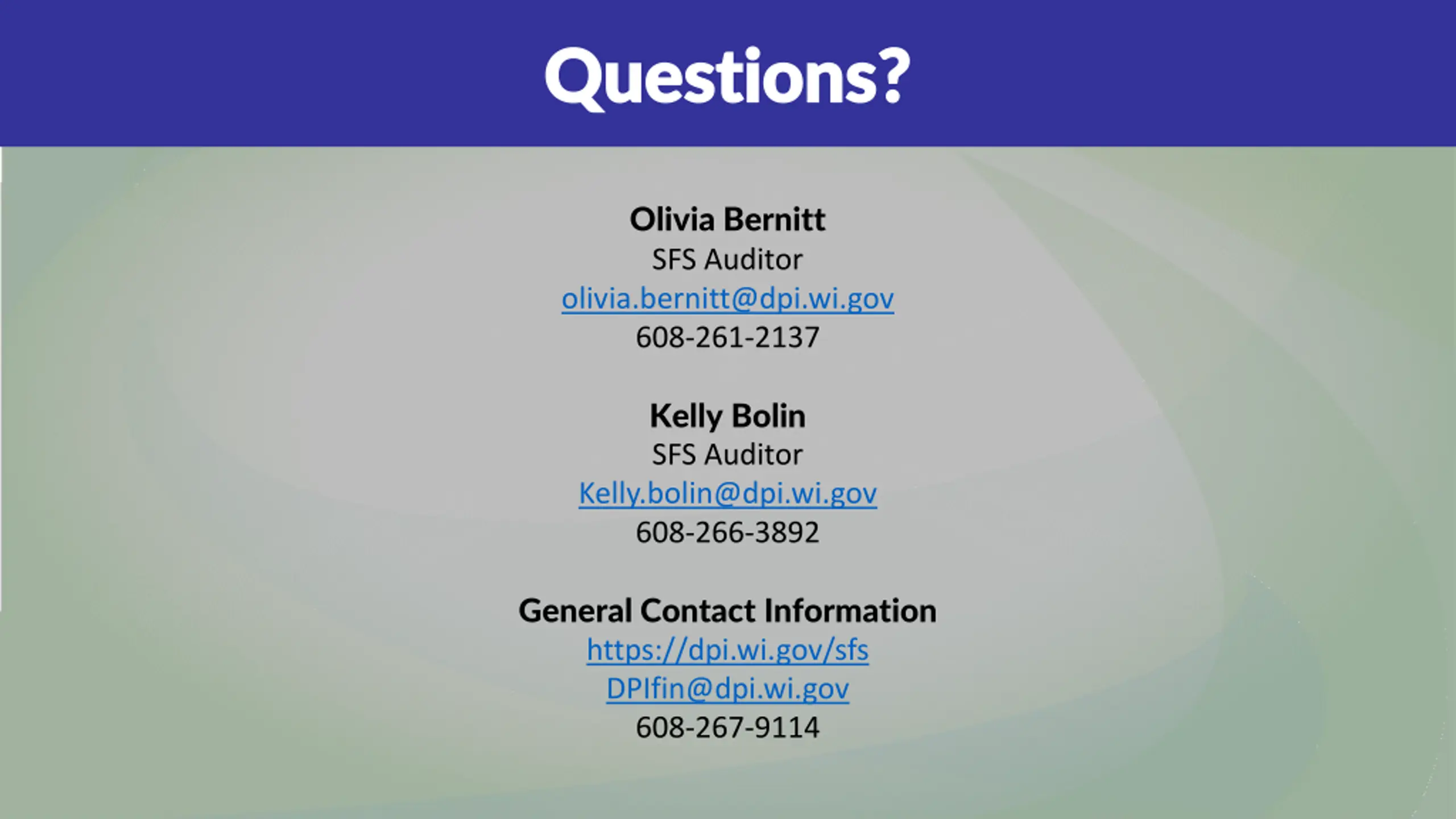 Questions? Questions? Olivia Bernitt SFS Auditor olivia.bernitt@dpi.wi.gov 608-261-2137 Kelly Bolin SFS Auditor Kelly.bolin@dpi.wi.gov 608-266-3892 General Contact Information https://dpi.wi.gov/sfs DPIfin@dpi.wi.gov 608-267-9114