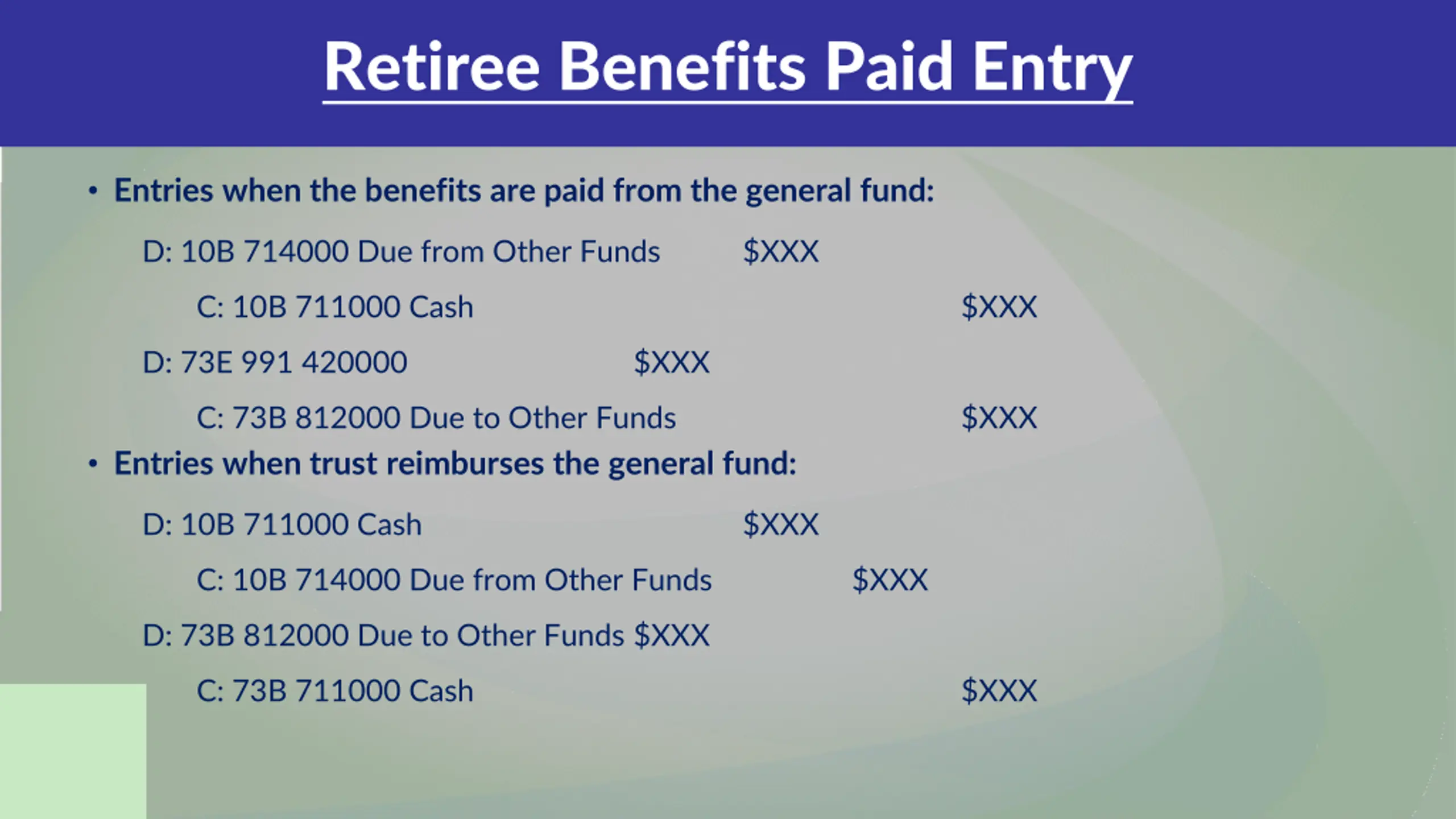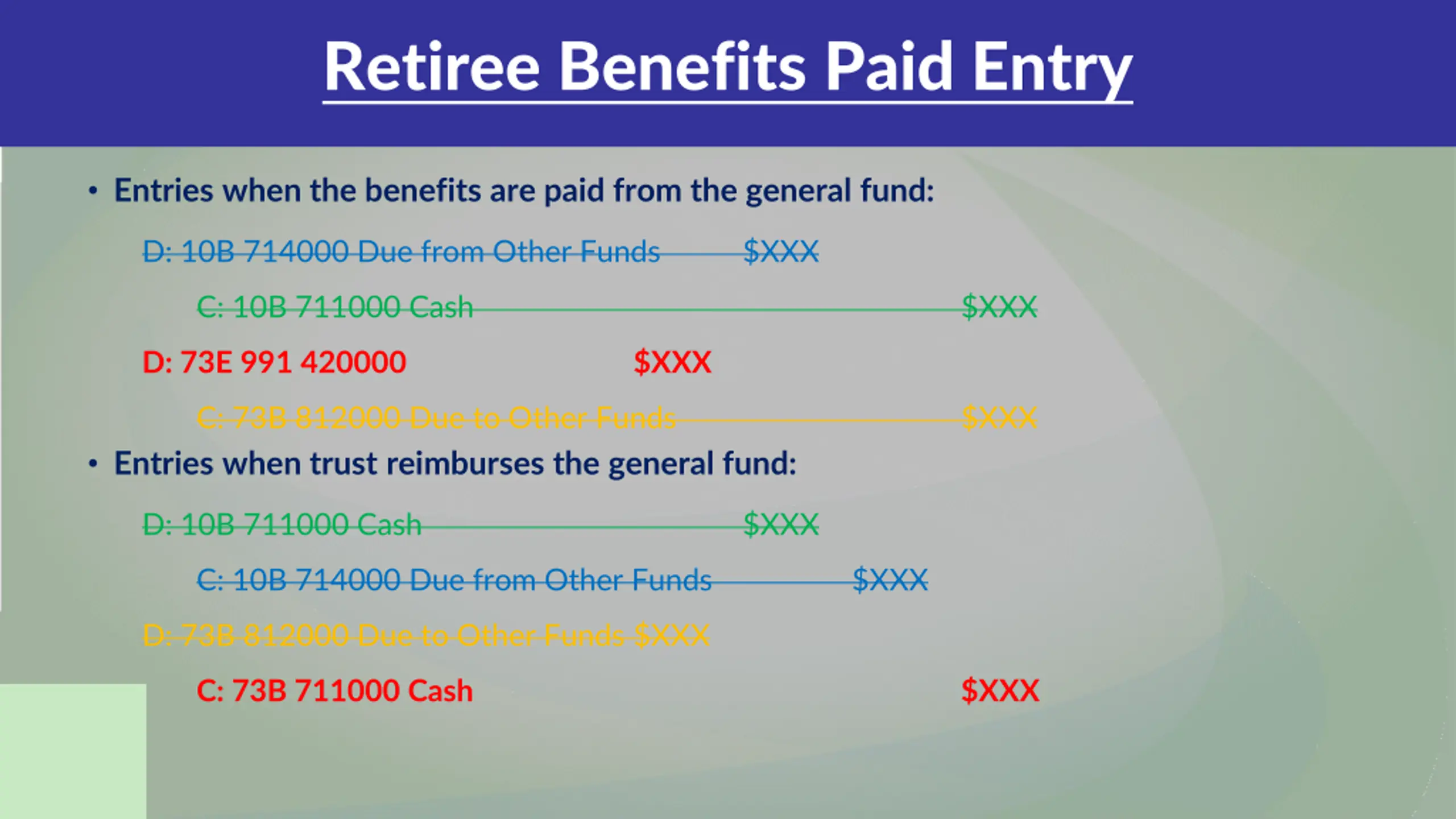 Retiree Benefits Paid Entry Entries when the benefits are paid from the general fund: D: 10B 714000 Due from Other Funds $XXX C: 10B 711000 Cash $XXX D: 73E 991 420000 $XXX C: 73B 812000 Due to Other Funds Entries when trust reimburses the general fund: $XXX D: 10B 711000 Cash $XXX C: 10B 714000 Due from Other Funds $XXX D: 73B 812000 Due to Other Funds $XXX C: 73B 711000 Cash $XXX