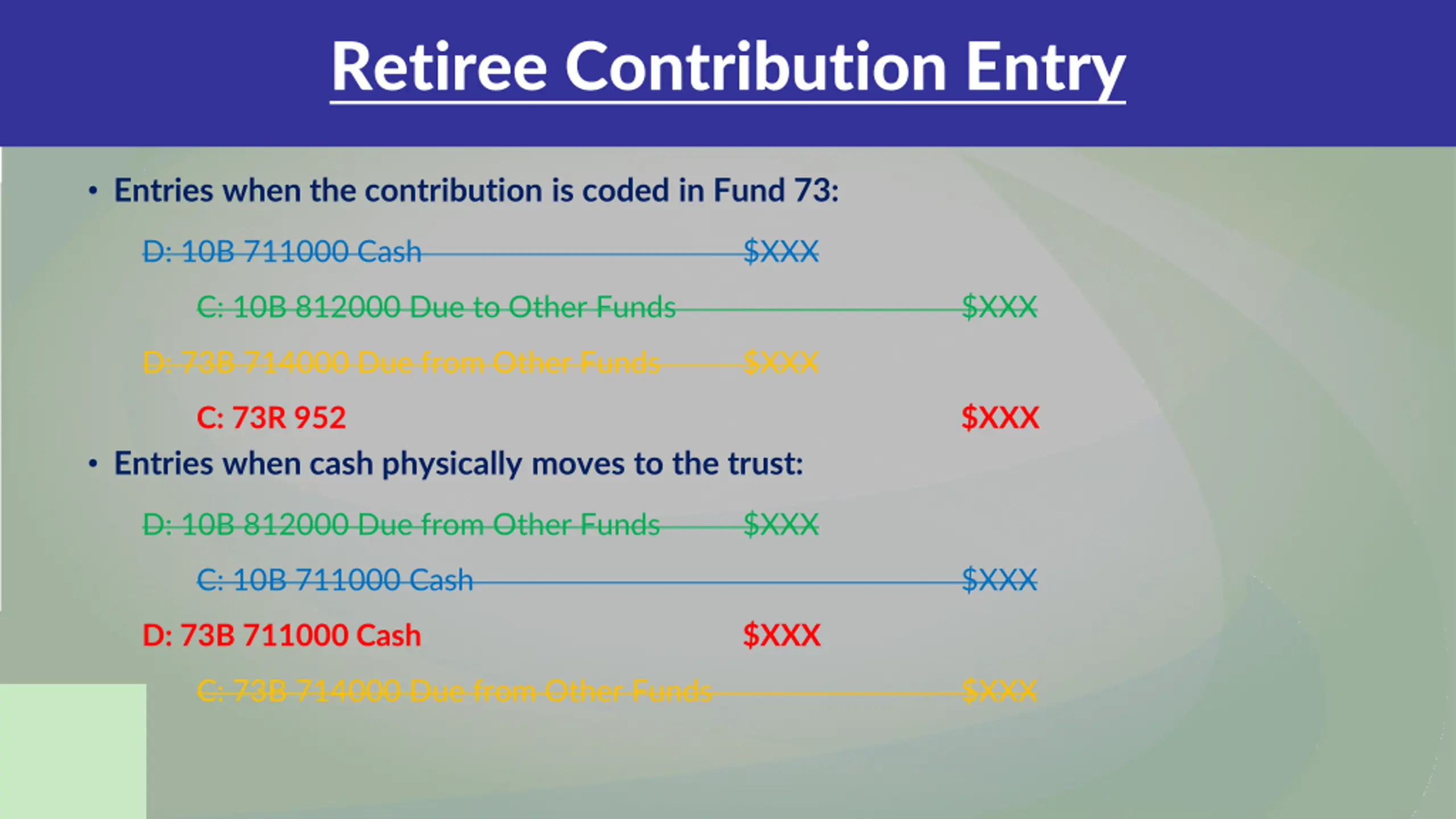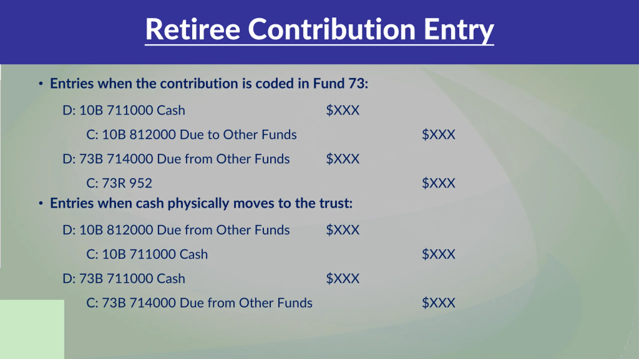 Retiree Contribution Entry Entries when the contribution is coded in Fund 73: D: 10B 711000 Cash $XXX C: 10B 812000 Due to Other Funds $XXX D: 73B 714000 Due from Other Funds $XXX C: 73R 952 $XXX Entries when cash physically moves to the trust: D: 10B 812000 Due from Other Funds $XXX C: 10B 711000 Cash $XXX D: 73B 711000 Cash $XXX C: 73B 714000 Due from Other Funds $XXX