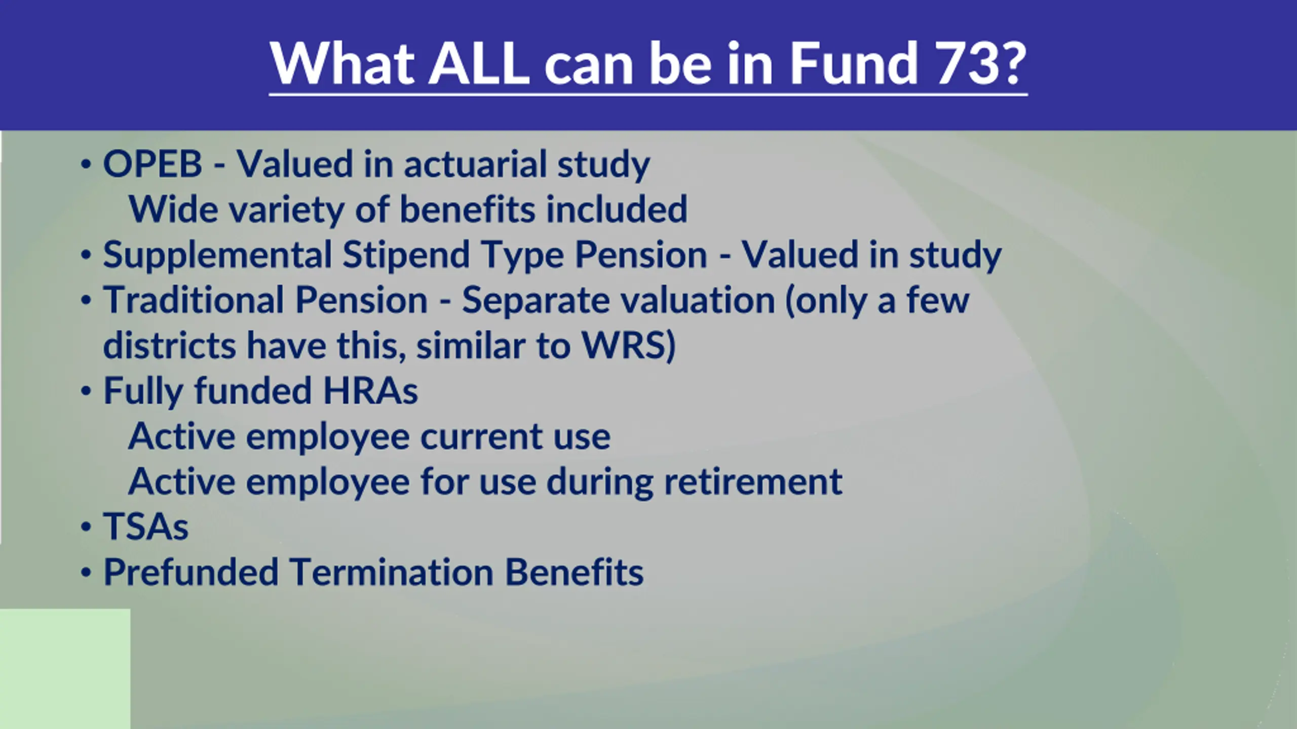 What ALL can be in Fund 73? OPEB - Valued in actuarial study Wide variety of benefits included Supplemental Stipend Type Pension - Valued in study Traditional Pension - Separate valuation (only a few districts have this, similar to WRS) Fully funded HRAs Active employee current use Active employee for use during retirement TSAs Prefunded Termination Benefits