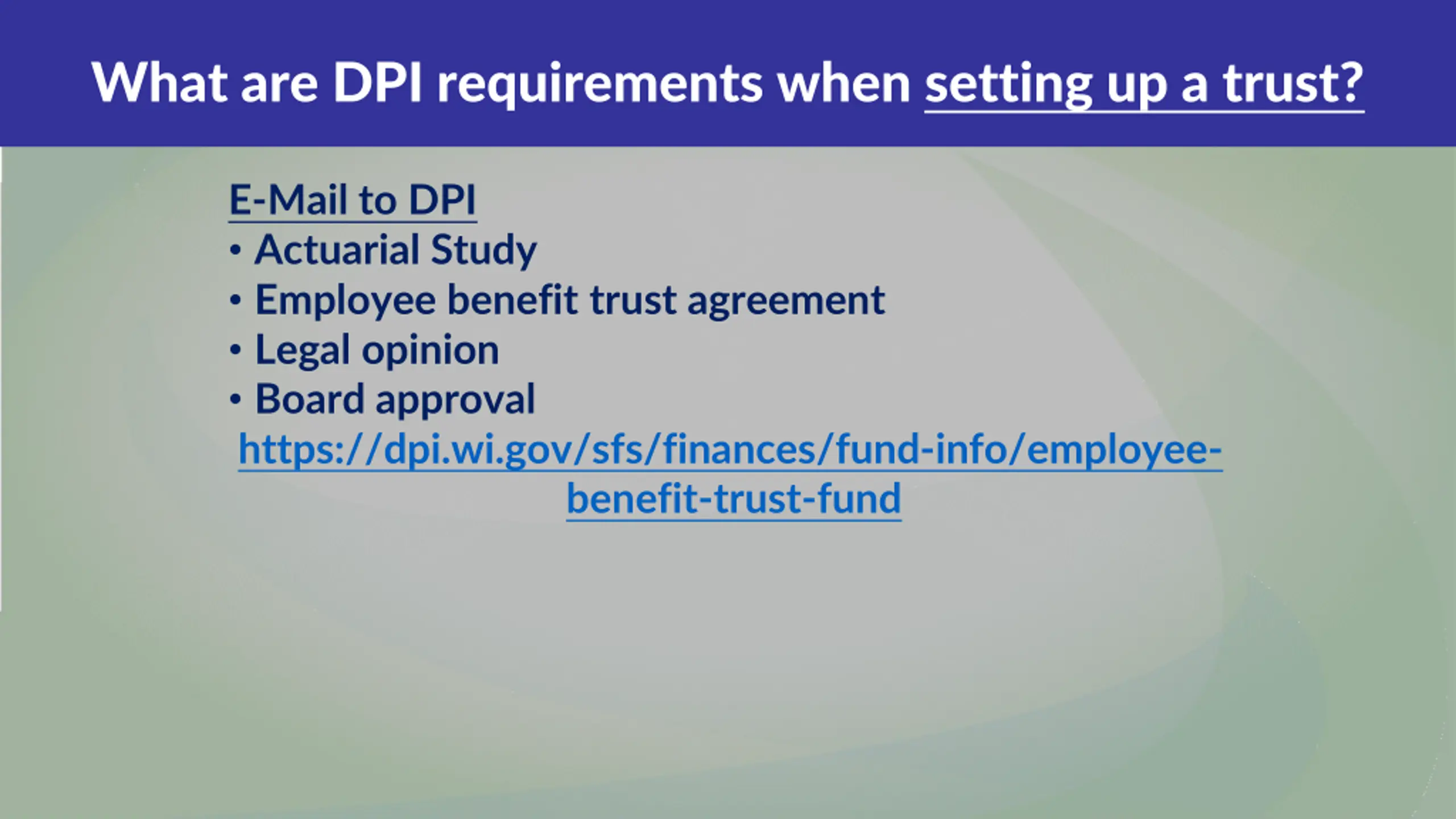 What are DPI requirements when setting up a trust? E-Mail to DPI Actuarial Study Employee benefit trust agreement Legal opinion Board approval https://dpi.wi.gov/sfs/finances/fund-info/employee- benefit-trust-fund