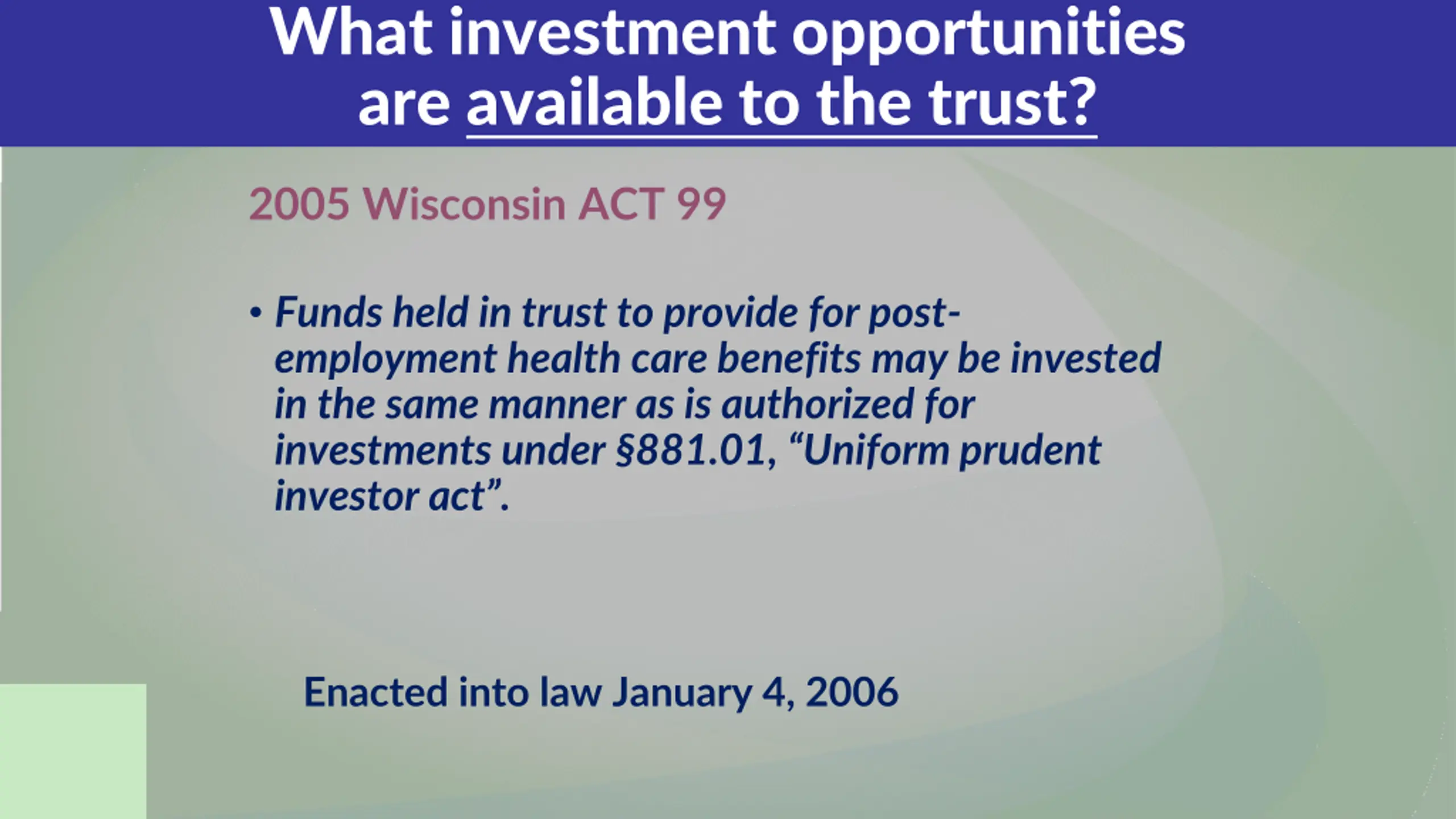 What investment opportunities are available to the trust? 2005 Wisconsin ACT 99 Funds held in trust to provide for post- employment health care benefits may be invested in the same manner as is authorized for investments under 881.01, Uniform prudent investor act . Enacted into law January 4, 2006