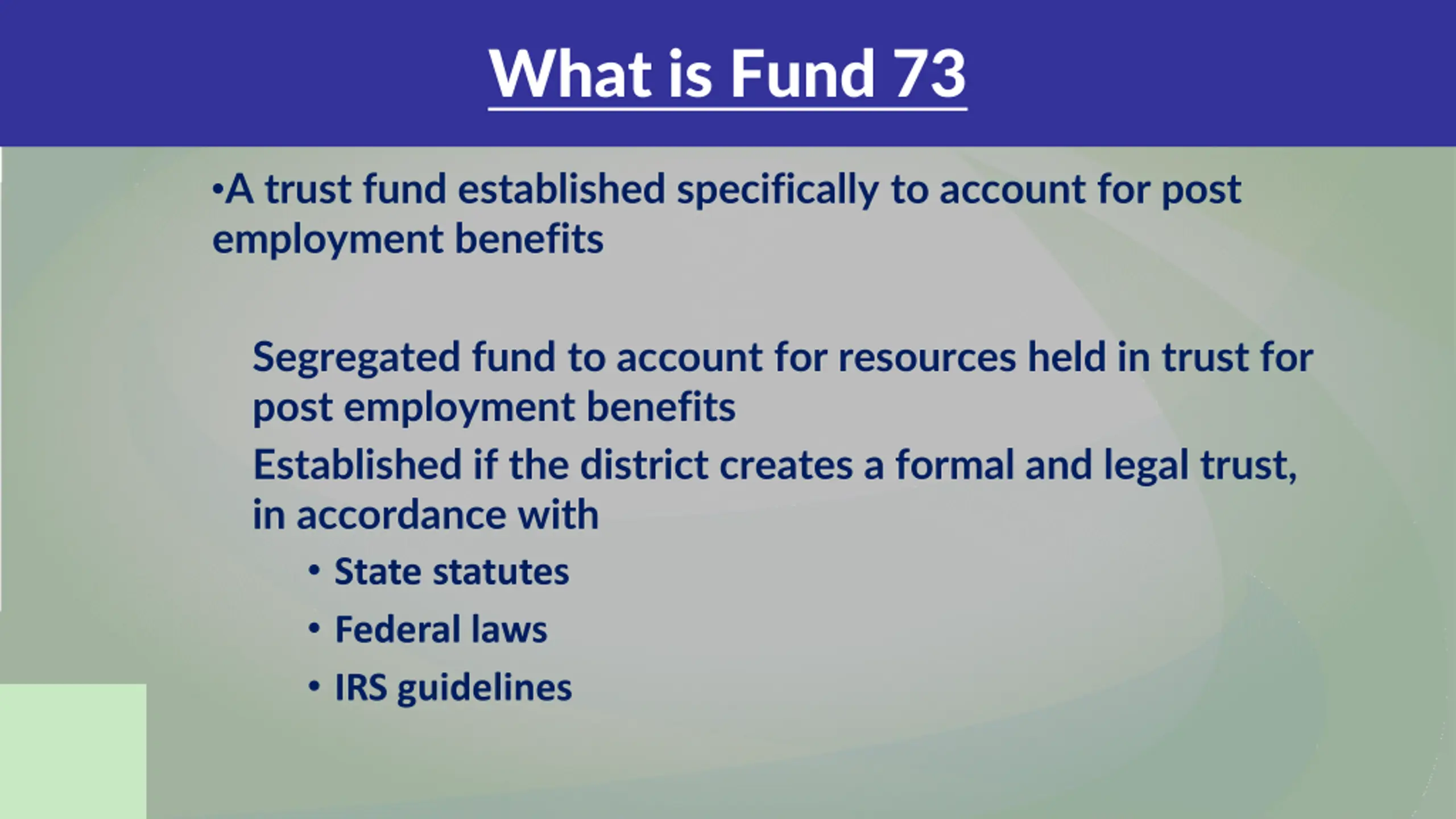 What is Fund 73 A trust fund established specifically to account for post employment benefits Segregated fund to account for resources held in trust for post employment benefits Established if the district creates a formal and legal trust, in accordance with State statutes Federal laws IRS guidelines