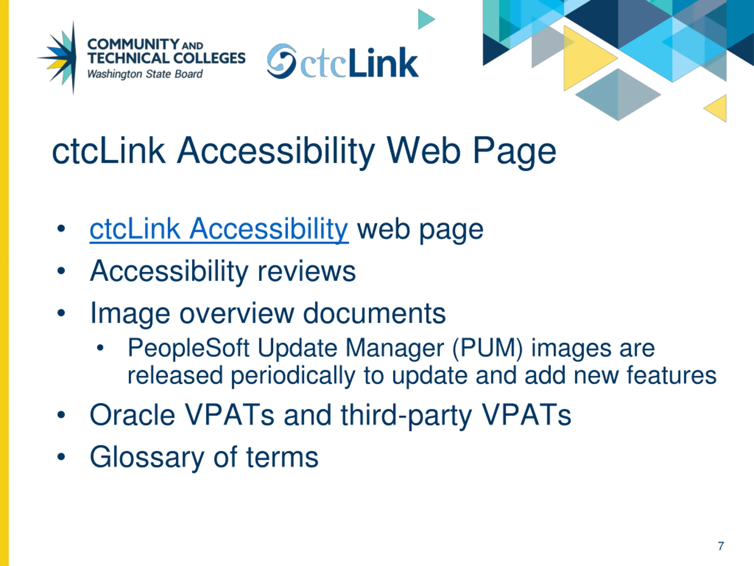 ctcLink Accessibility Web Page ctcLink Accessibility web page Accessibility reviews Image overview documents PeopleSoft Update Manager (PUM) images are released periodically to update and add new features Oracle VPATs and third-party VPATs Glossary of terms 7